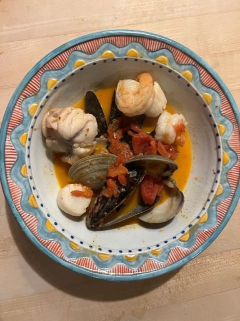Shrimp, clams, mussels, scallops and monk fish in Thai Red Curry stew