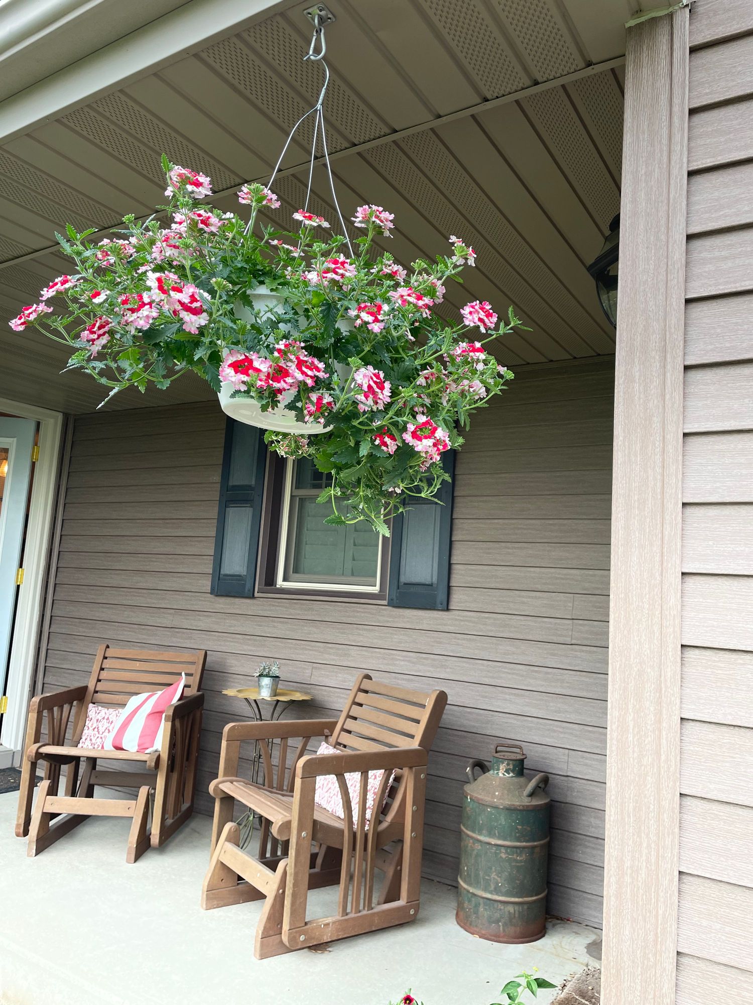 The picture makes the verbena basket look huge, but it was still big, and note that it coordinates with the cushions. I like to sit here and read and ignore all the dandelions in my lawn. (It’s all about perspective).
