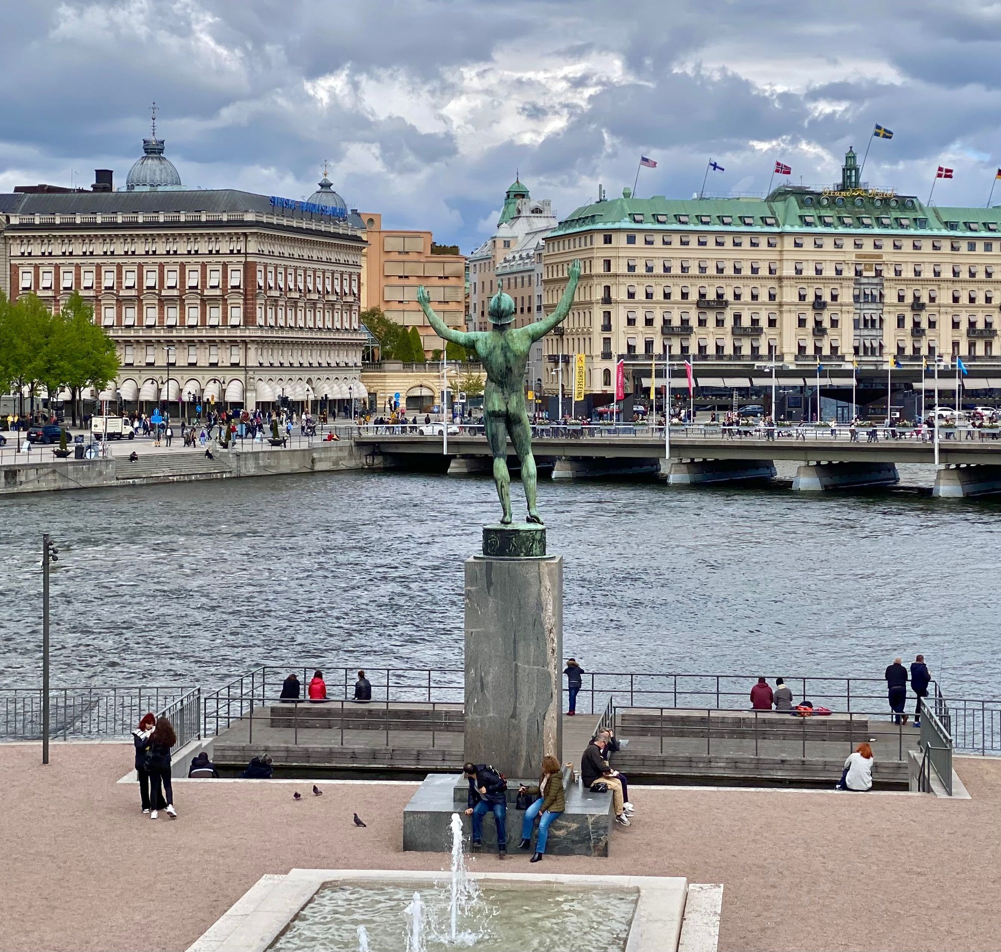 Norrmalm from Strömparterren Park with Sun Singer statue in foreground