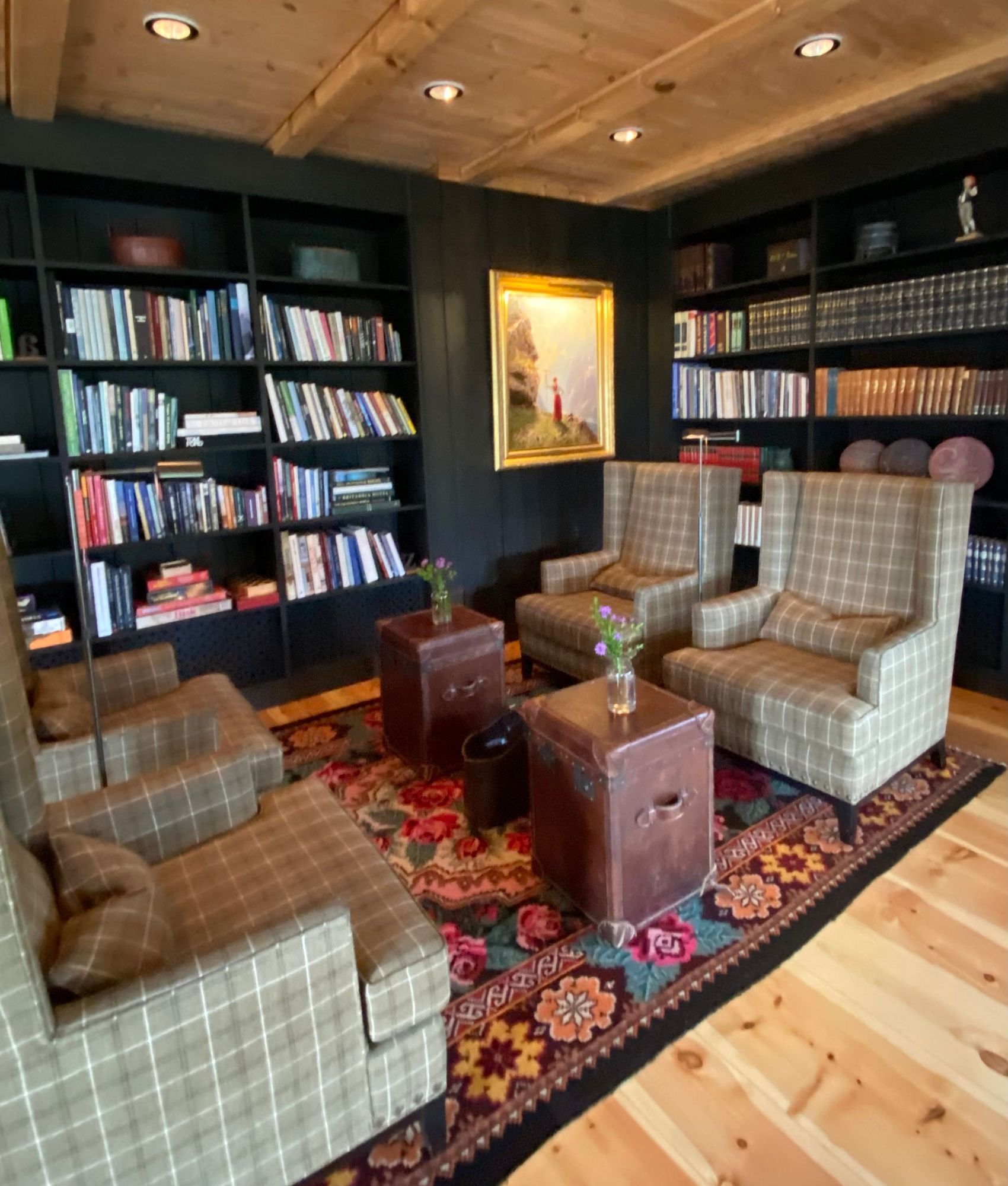 One of many cozy books and crannies in which to relax, read a book or have a drink.