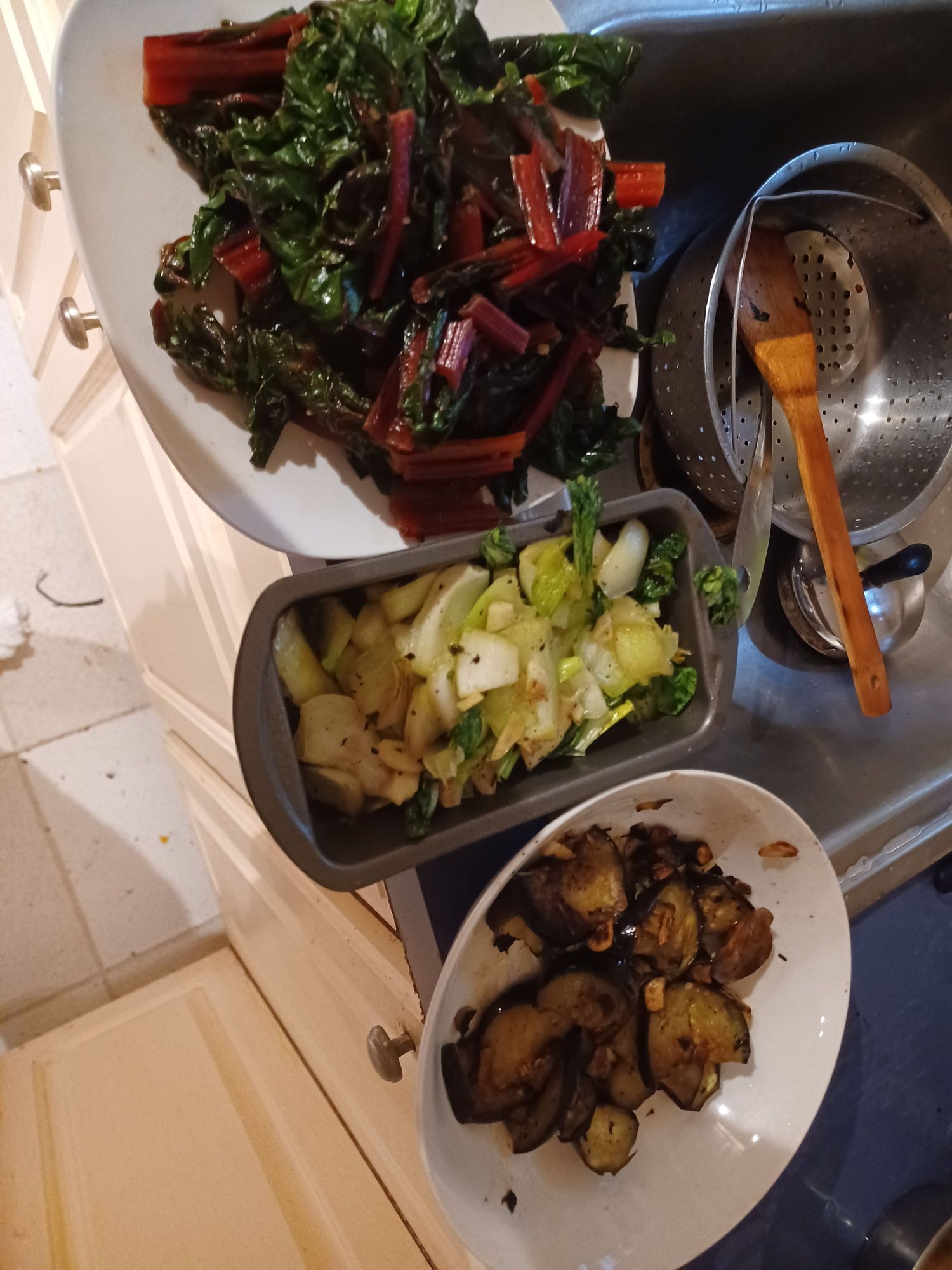 Swiss chard, baby bok choy, and Japanese eggplant. I have a little leftover brown rice.