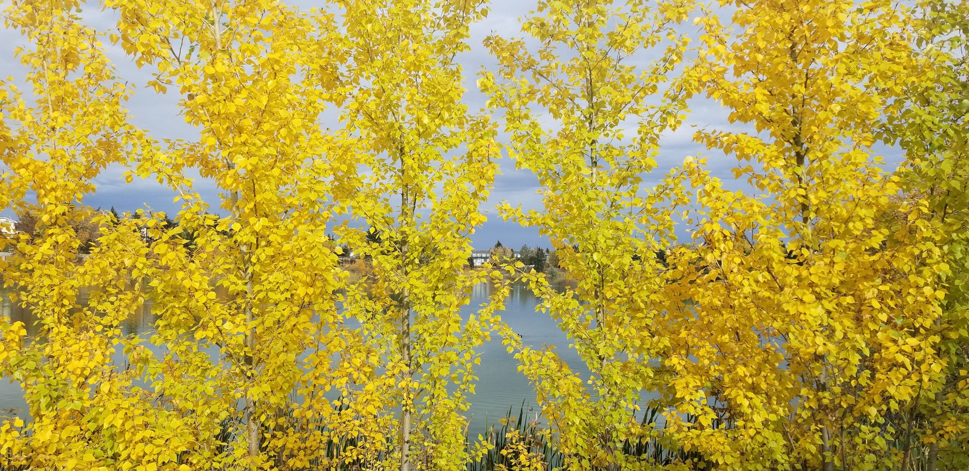 Going for my walk around the lake. Our colours are yellow, orange and red. The maple trees and the Mountains Ash are red.