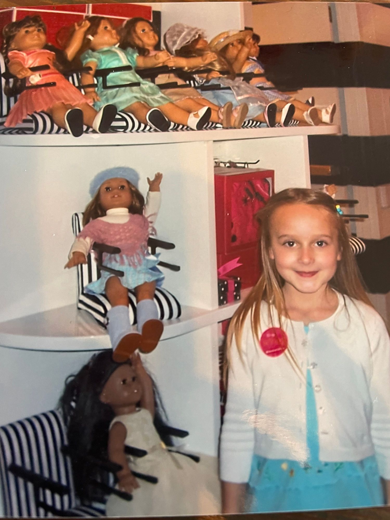 This was my granddaughter’s 7th birthday party at the American Girl doll store in downtown Chicago. Here she is at the entrance to the restaurant by the doll’s booster seats. These seats attached to the table so the dolls could be at the party. Oh, this place thought of everything! It was a little girl’s fantasy ( especially if that little girl liked dolls).