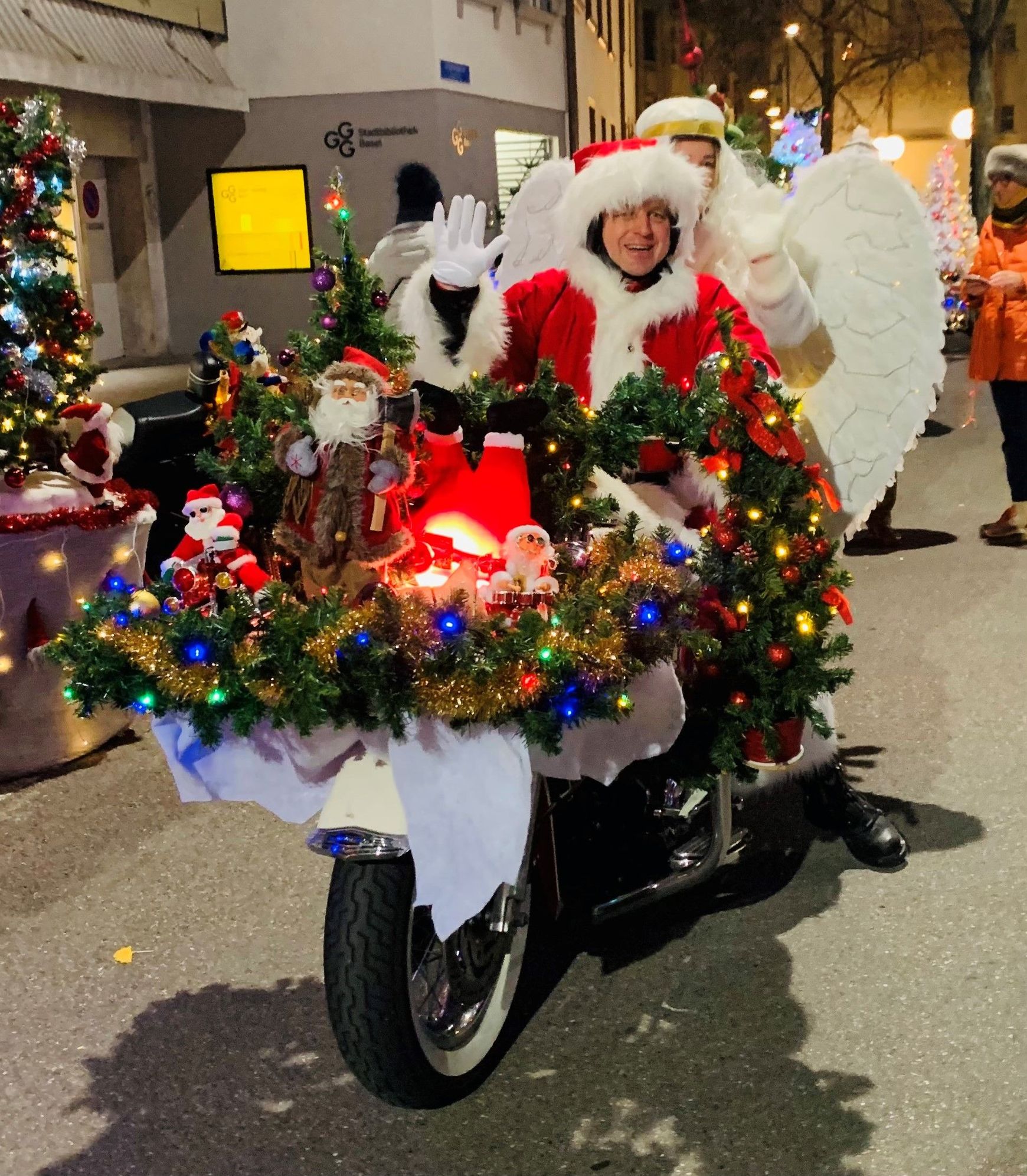 A little whimsy for today. Basel's Christmas market is internationally known, but another seasonal event enjoyed by the locals is the Harley Santas ride. Held annually on a Saturday in Advent, 'the motorcyclists elaborately decorate their Harleys and ride into the city as a group. They hand out presents on Marktplatz and then park up near the Hotel Basel, giving people a chance to look over the decorated bikes while the riders enjoy their own get-together. Fun for all!