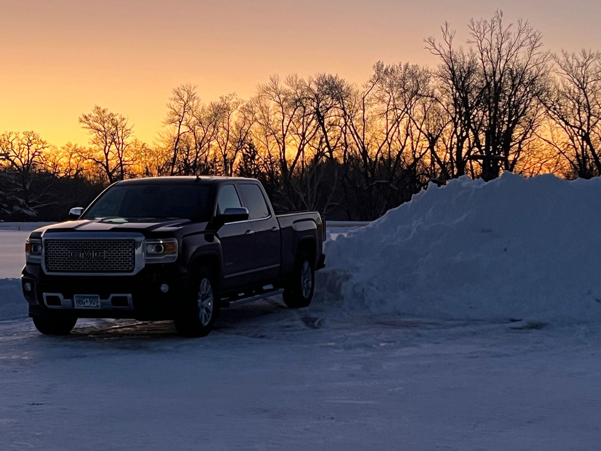 This morninbgs sunrise. Note the height of the snow pile. Parking lots all over this area now have a snow fence circling them.