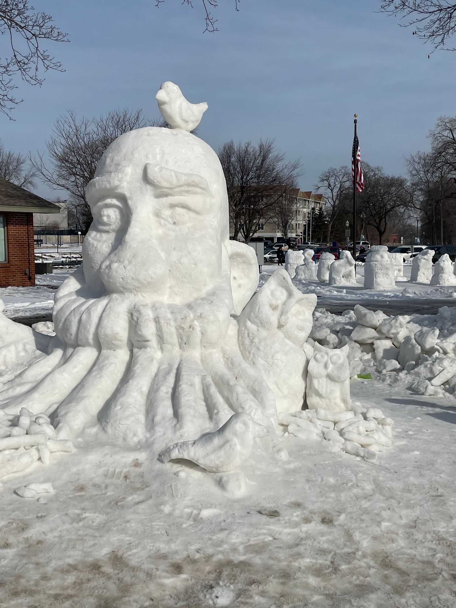 In the background are the kid’s sculpture competition. Melted blobs now, totally unidentifiable. I liked this guy’s eyebrows and the bird on his head.