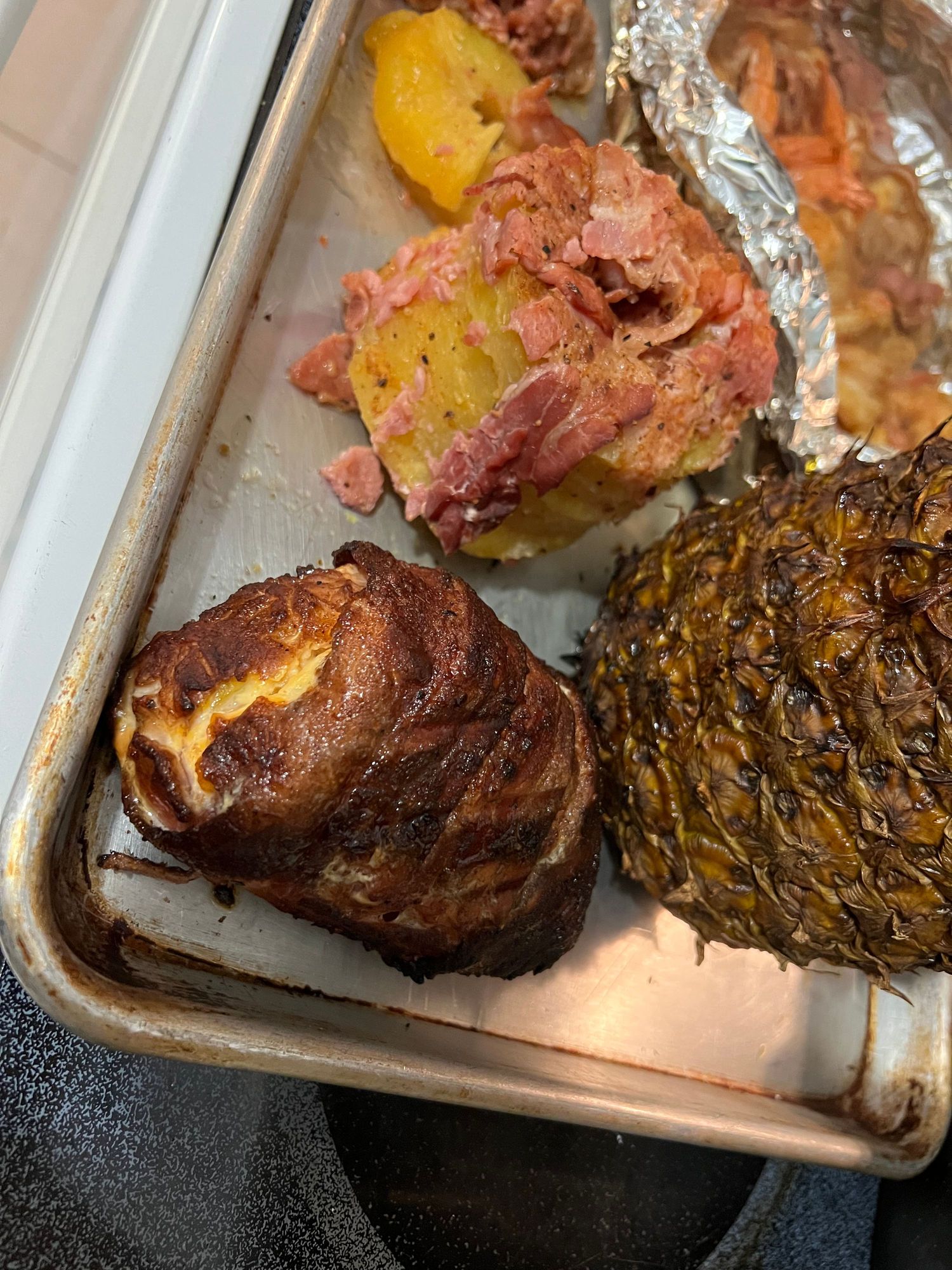 bacon wrapped chicken breast stuffed with cheese and broccoli. Bacon wrapped pinapple and shrimp and bacon in foil. The pinapple was the best of the bunch.