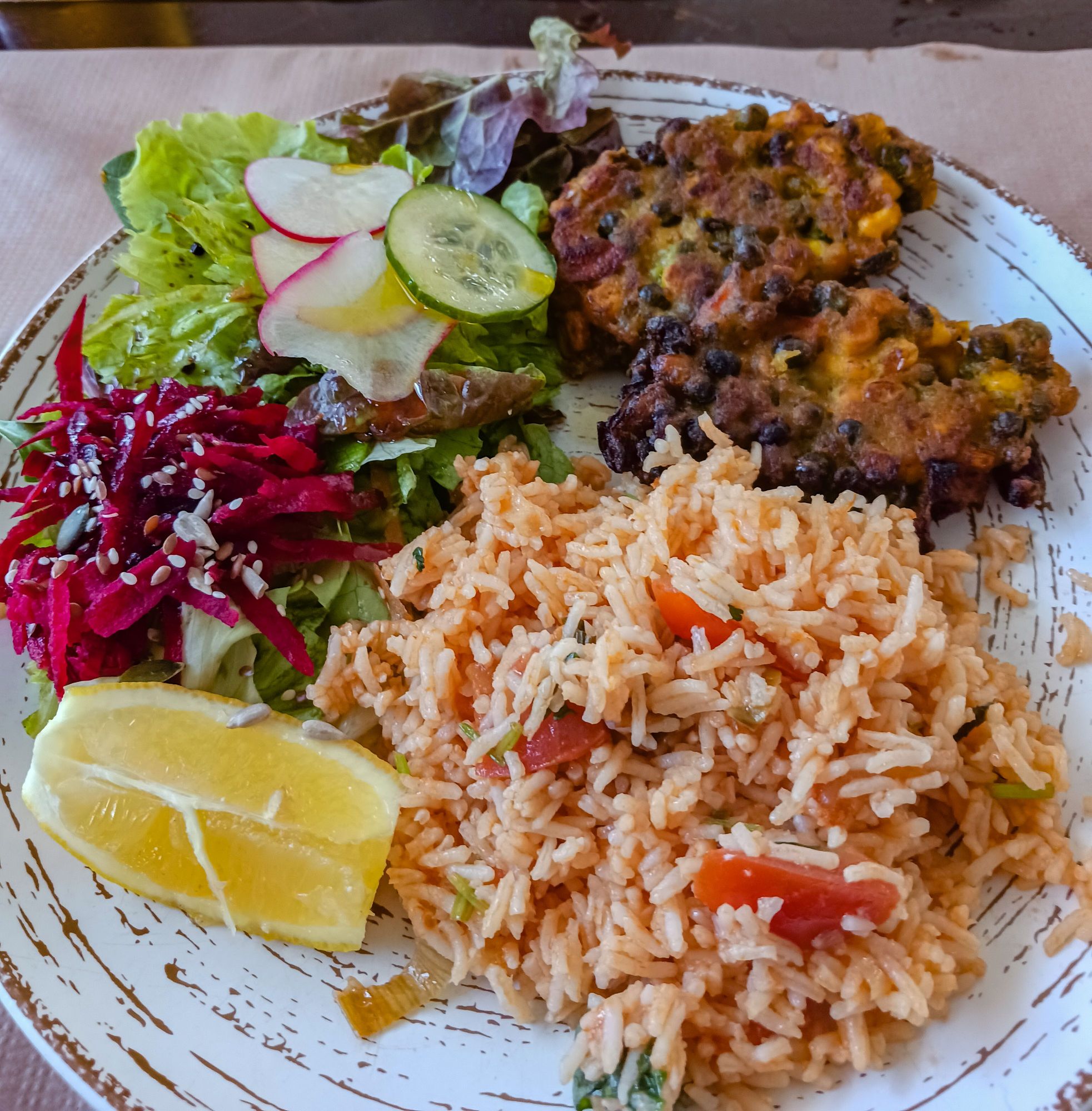 Plate of the day, vegetable cakes with tomato rice and salad