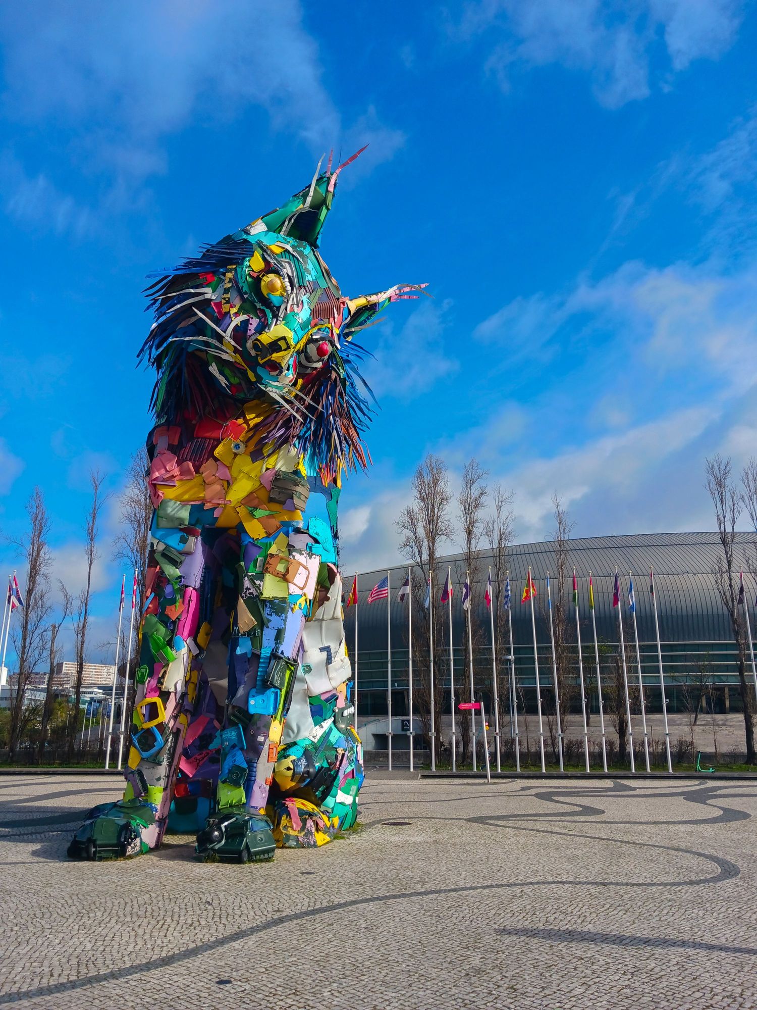 Cat statue, the oval behind it is the Altice Arena a music concert venue