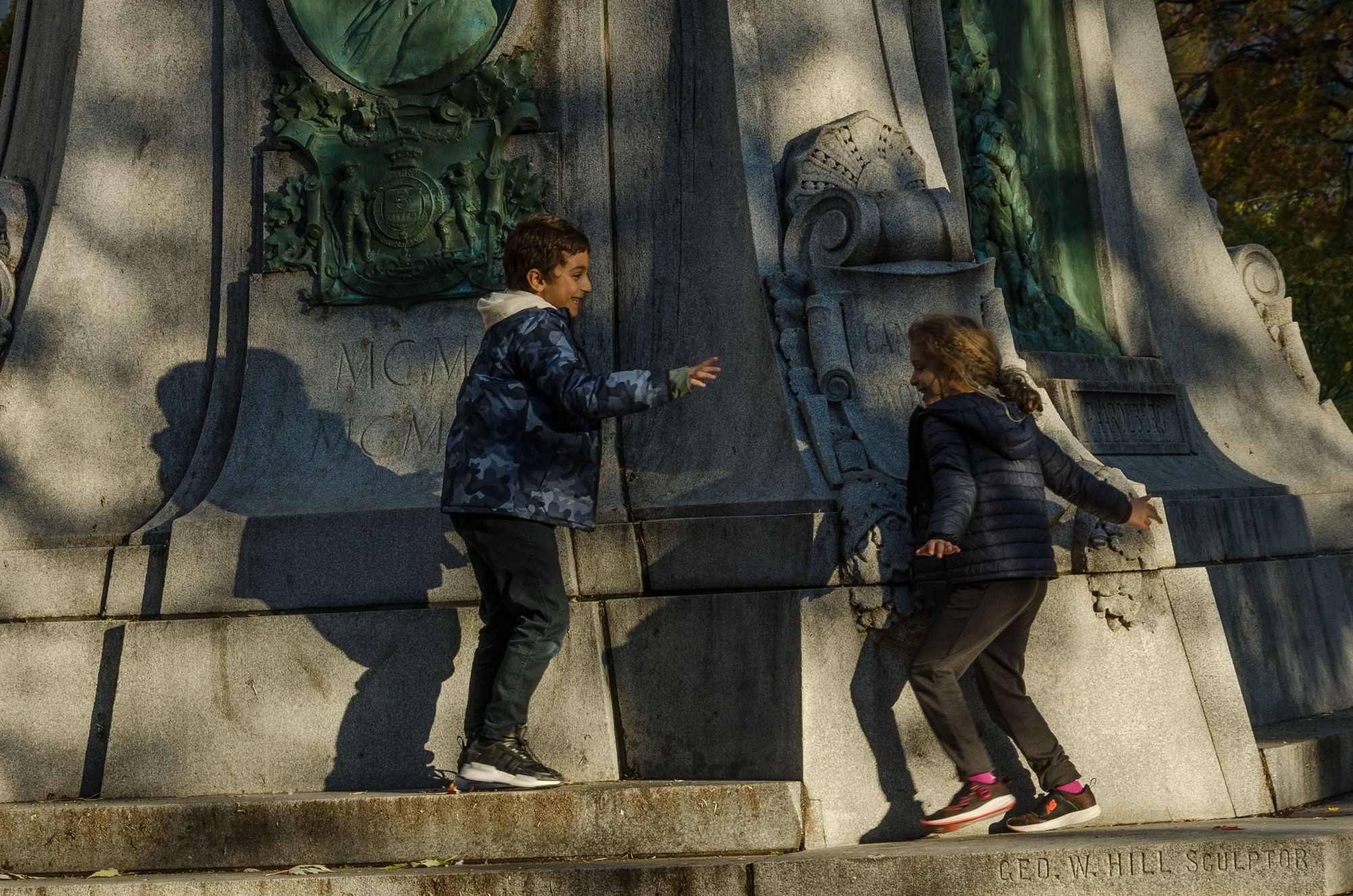 Brother and sister frolic around Dorchester Square downtown. My wife used to work there back when she was a whizz kid for that new invention called 'the computer'.