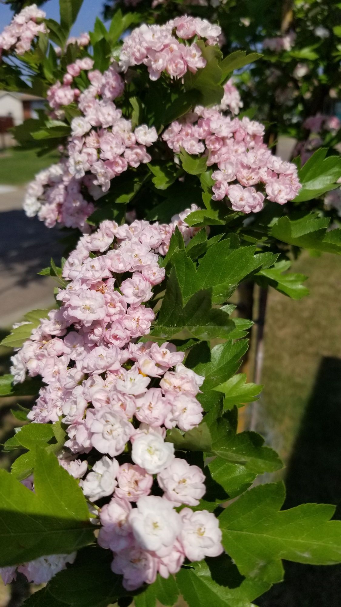 My two Hawthorns are in full bloom, first the flowers were white and then they turn to pink Sitting in the Sunroom enjoying them.!!