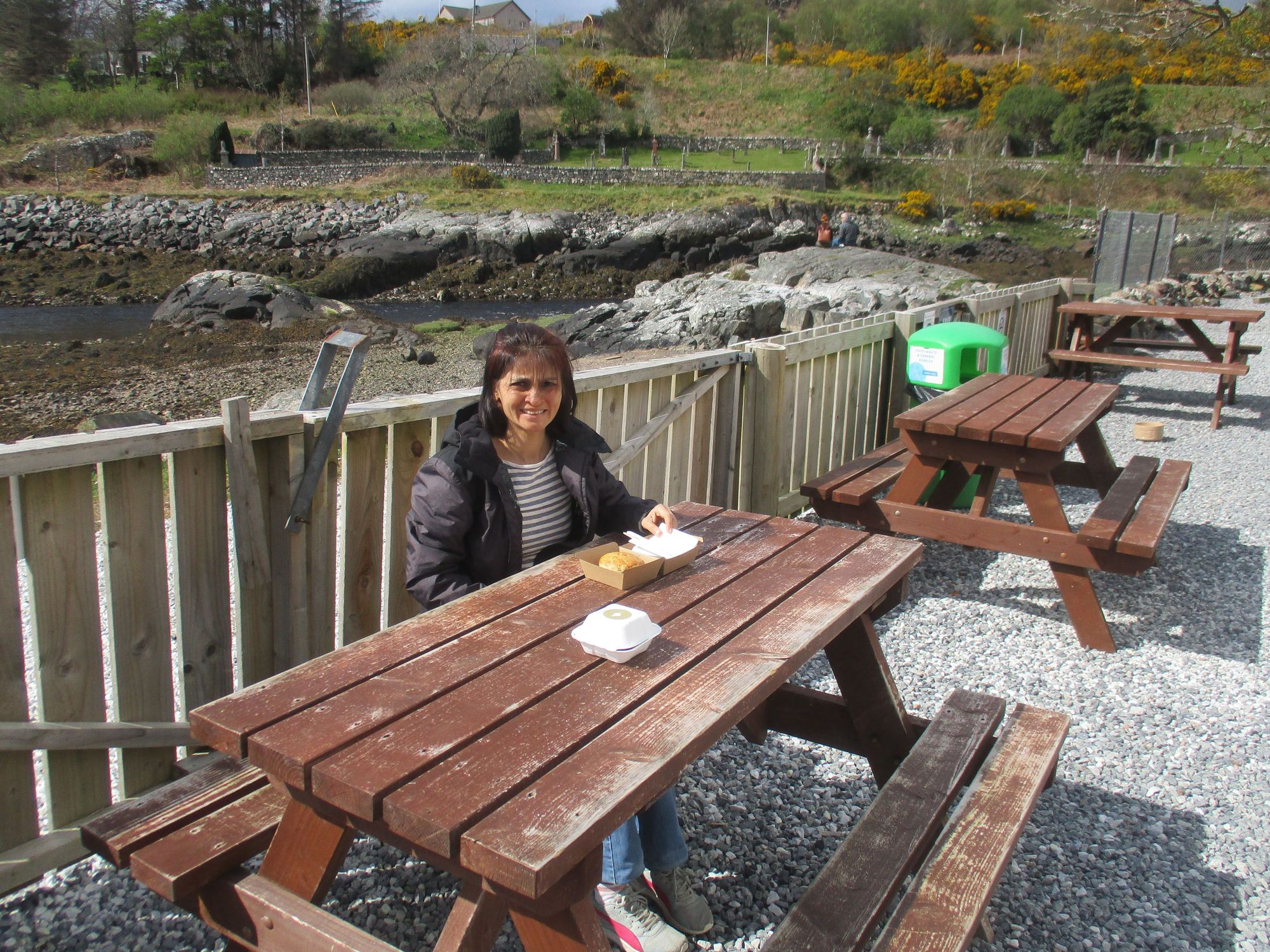 Outside the pieshop, benches by the river