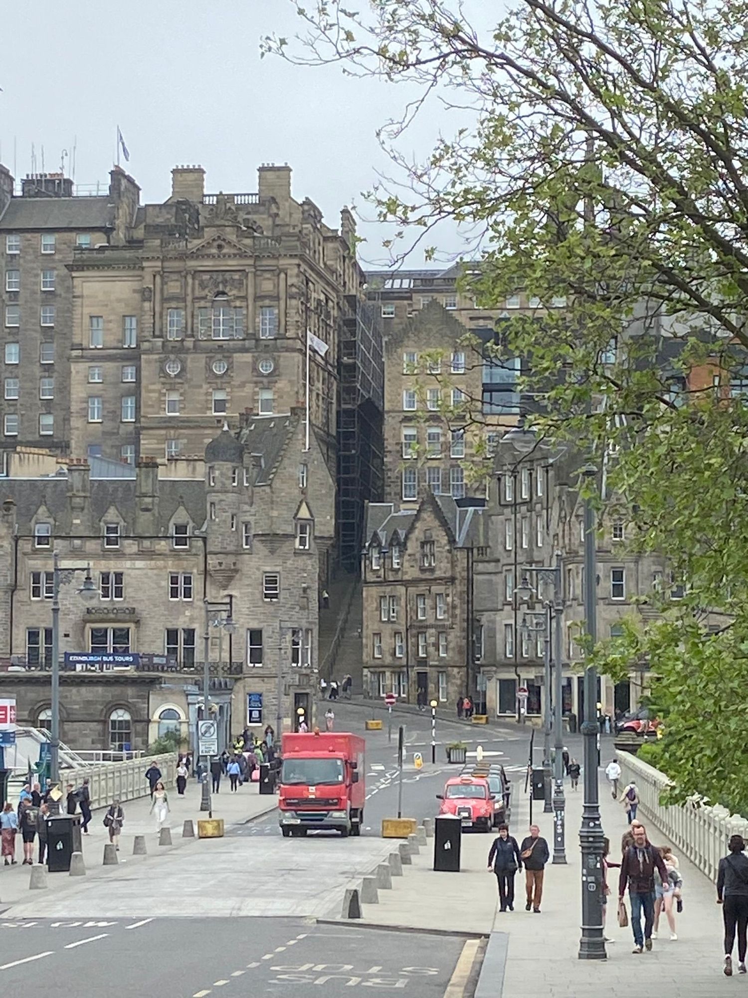 Walking across Waverley Bridge to Old Town. We love the architecture and ambiance.