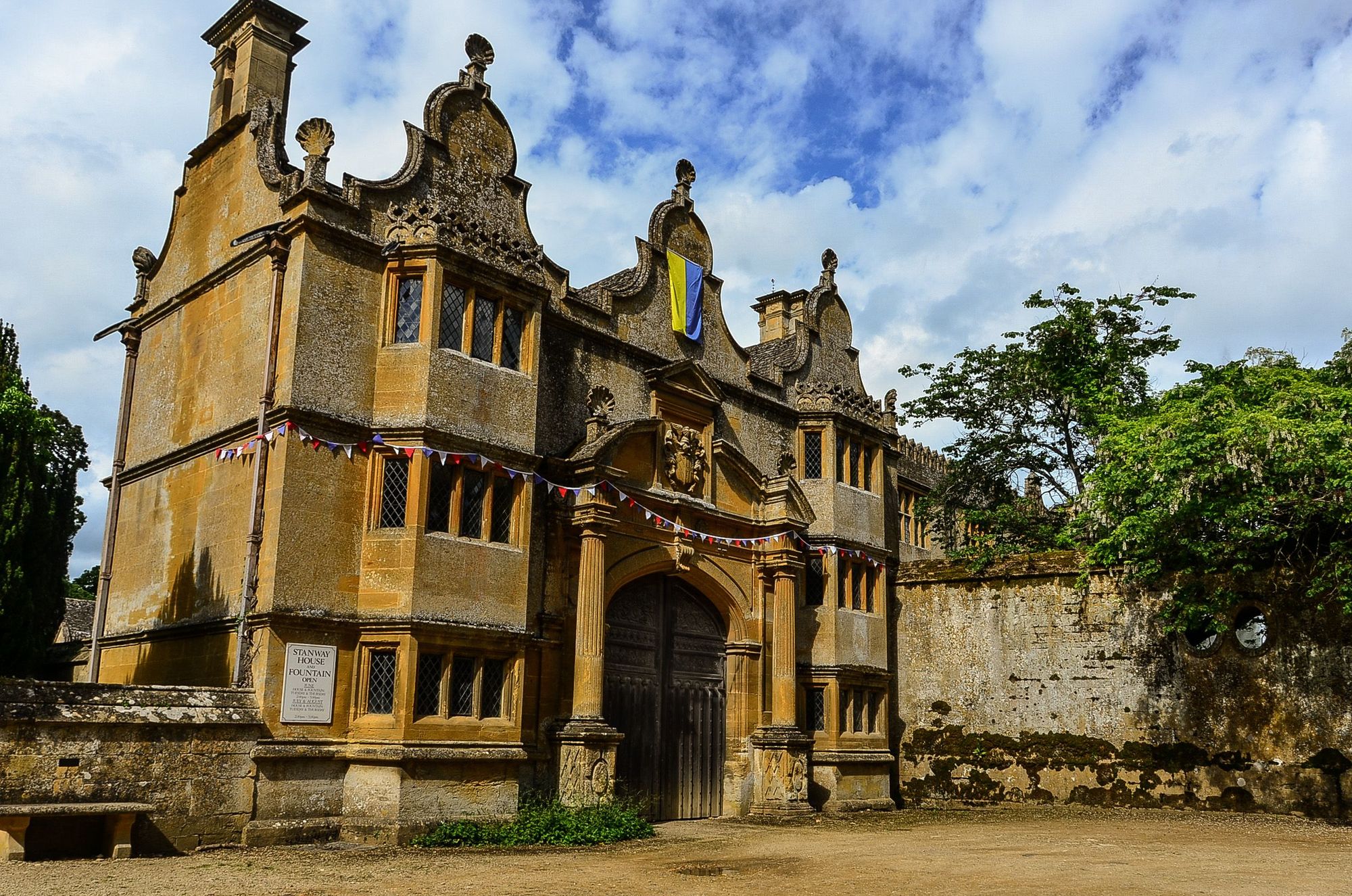 Stanway: the renown Stanway house gatehouse (note Ukrainian flag). The famed fountain was then taking a break. It only shoots twice a day. Btw, the 45 minute walk from Stanton down to Stanway is a very compelling one. The route passes by Shenberrow Hill, the Rayers Brake pasture ('more like parkland'--Rick Steves), abandoned stone huts, gnarly denuded trees, ditches, crops and hedges--archetype Cotswolds.