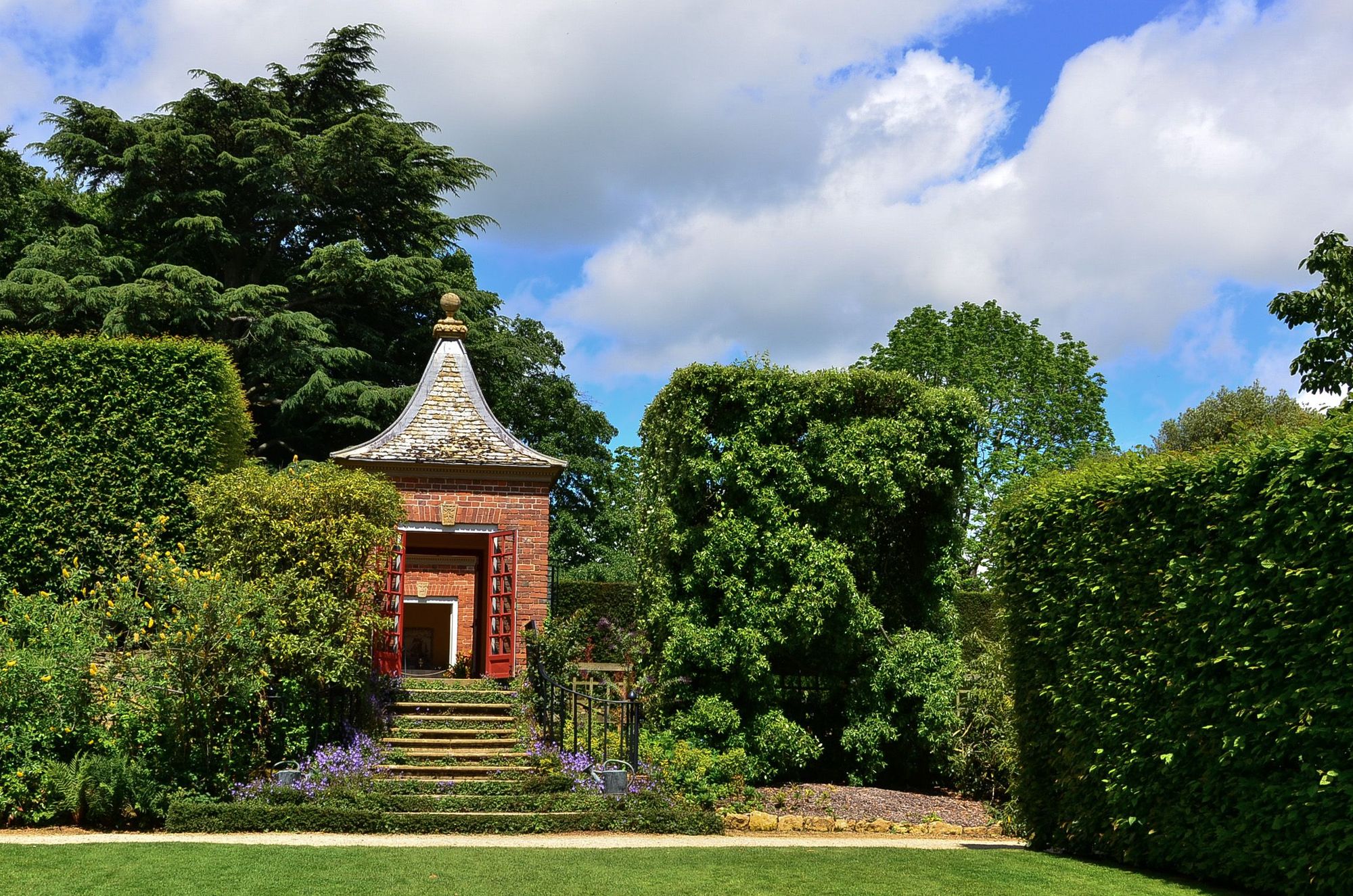 At Hidcote, we lay on the lawn beneath a massive holm oak. This pavilion was a convenient shelter for all of us visitors during the brief rain shower. It was interesting to see how different tourists behaved towards one another squashed in there, after hours of assiduously trying to avoid any eye contact with each other onsite!
