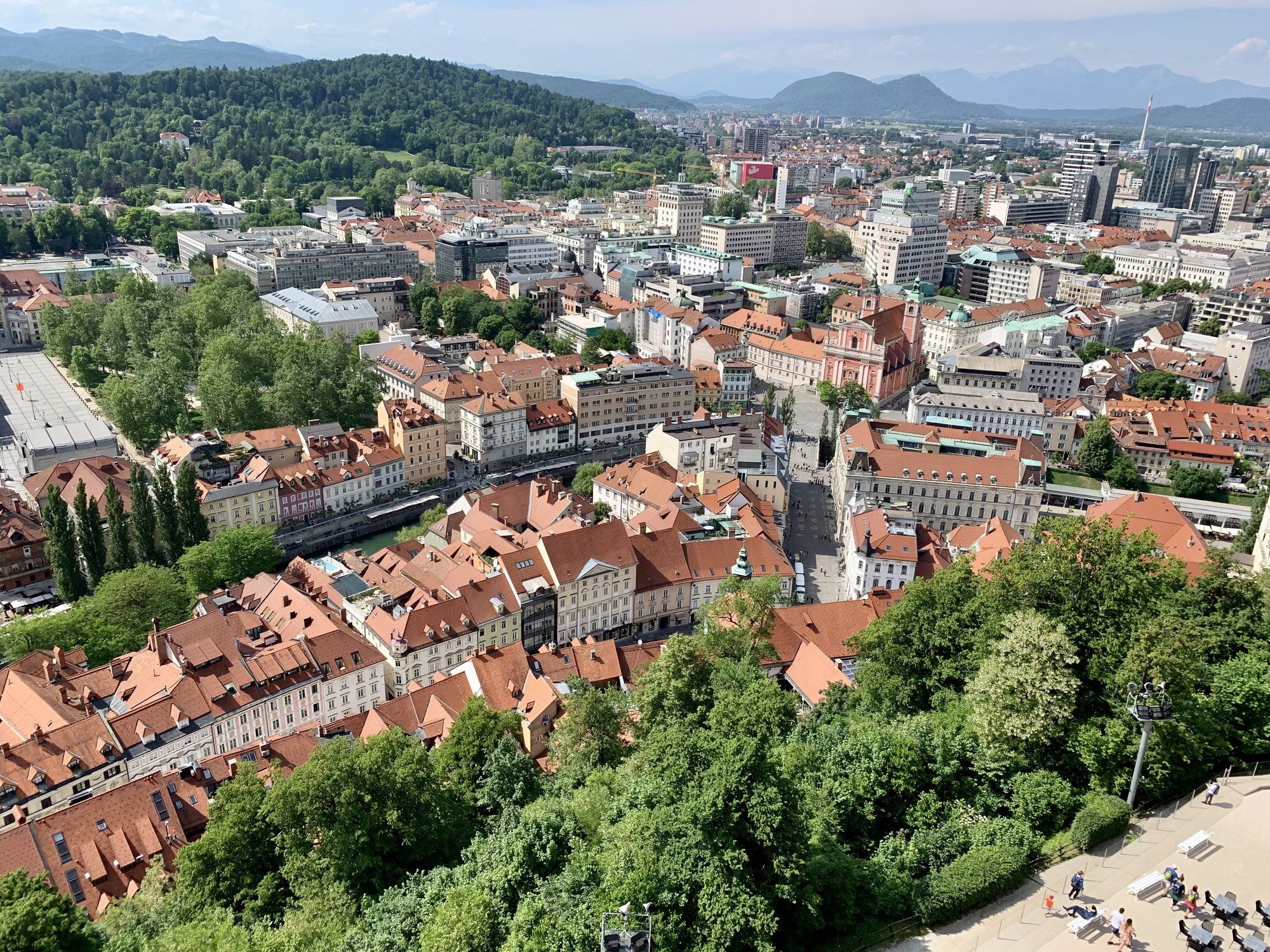 This is dcd's picture. Okay you see that red roofed house alone in the forest in the upper left. From that house move towards you about 1 1/2 inches and you come to a Red Roof ( and Turret) just peeking above the white building that has the dormer with 2 windows. That is the USA Embassy. Don't blame me if you cannot find it !! dcd took the picture
