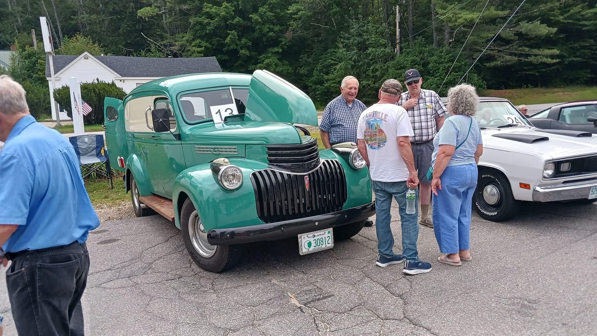 1946 Checy Panel truck. Dh is facing the camera, guy with no hat. Cruise night friends have back to camera. Dh was still feeling like an invalid when we first arrived so made me order sandwiches and sign us in. After eating he disappeared until it was time to go.