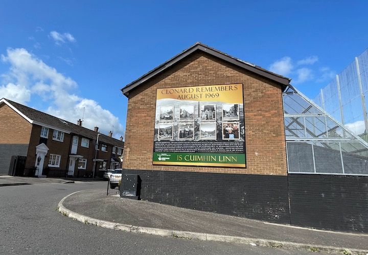 The peace wall is at the far right. The metal fixtures in the backs of the houses was to deflect Molotov cocktails thrown over the wall. Today, people through blue and red golf balls.