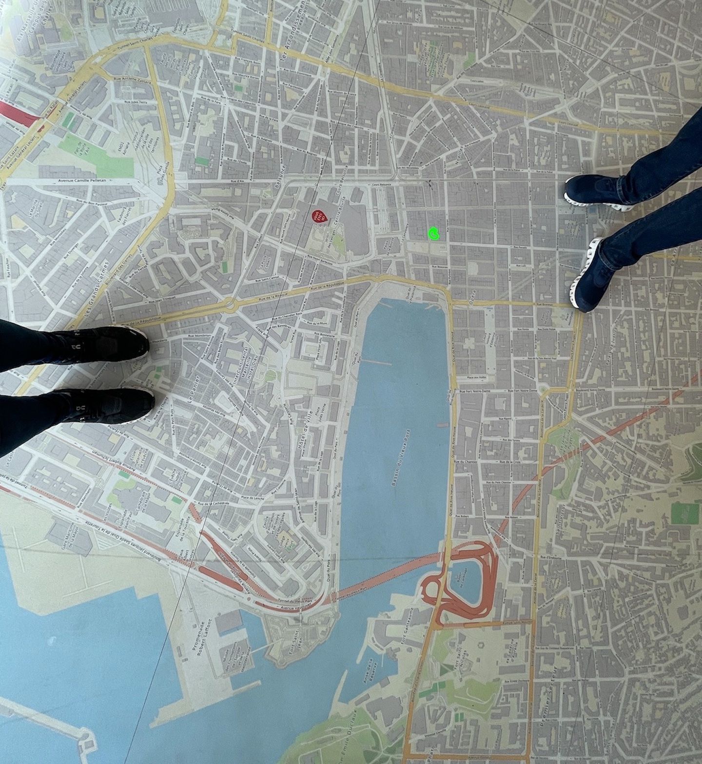 Giant floor map of modern Marseille. The red dot between us is the location of the museum, which was on the site of the ancient port. The green dot (I added) is where we stayed.