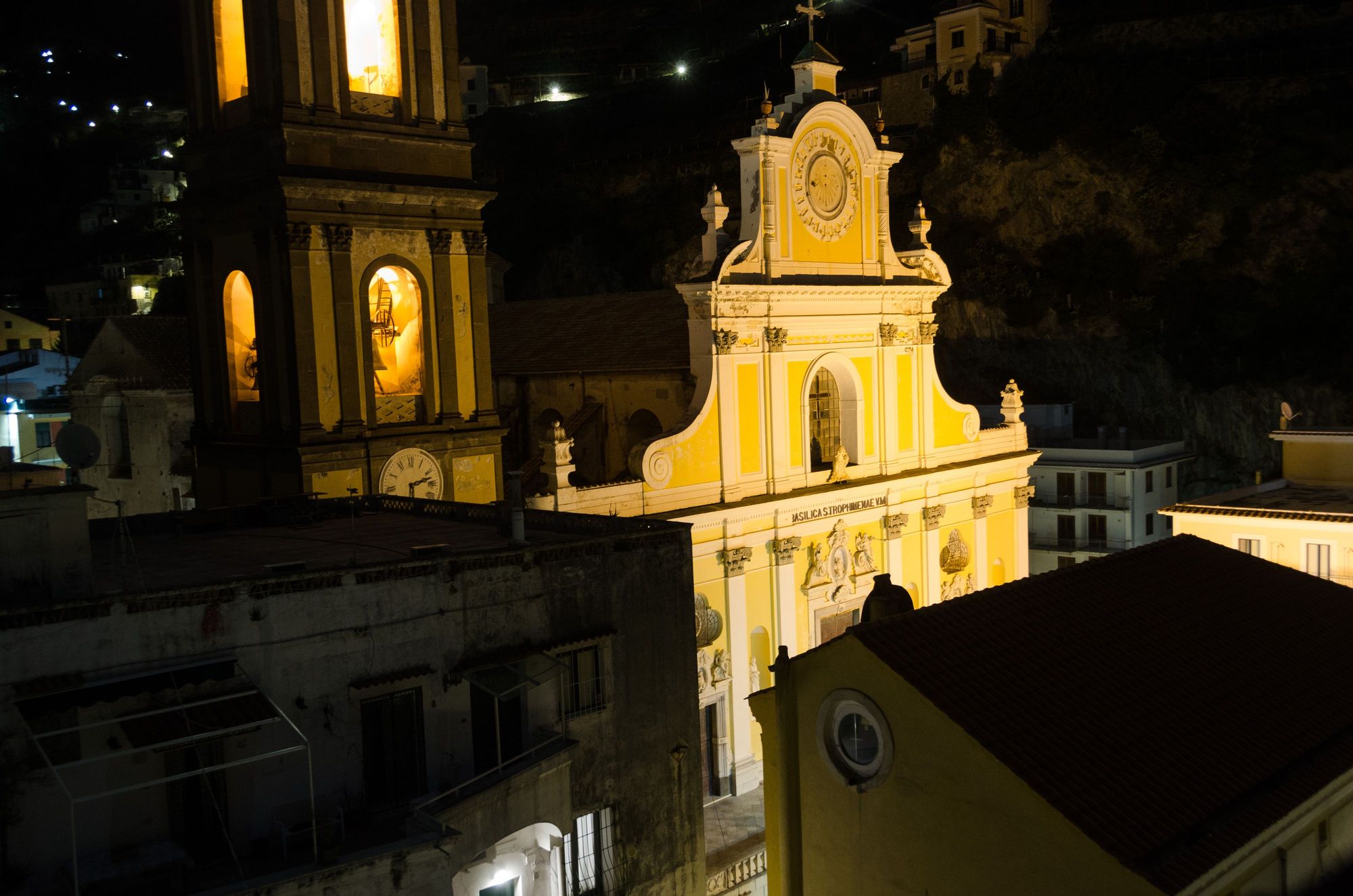 Our rental apartment (Le Zinefra) was that rare thing across the coast: a mid-range property with its own antique lift! That cut down on the number of steps coming and going. Owners Anna and Oscar Gambardella offer excellent value. Their description of '360 degree views' was accurate. Shown here through our rear-facing, floor-to-ceiling kitchen window, the town's church.