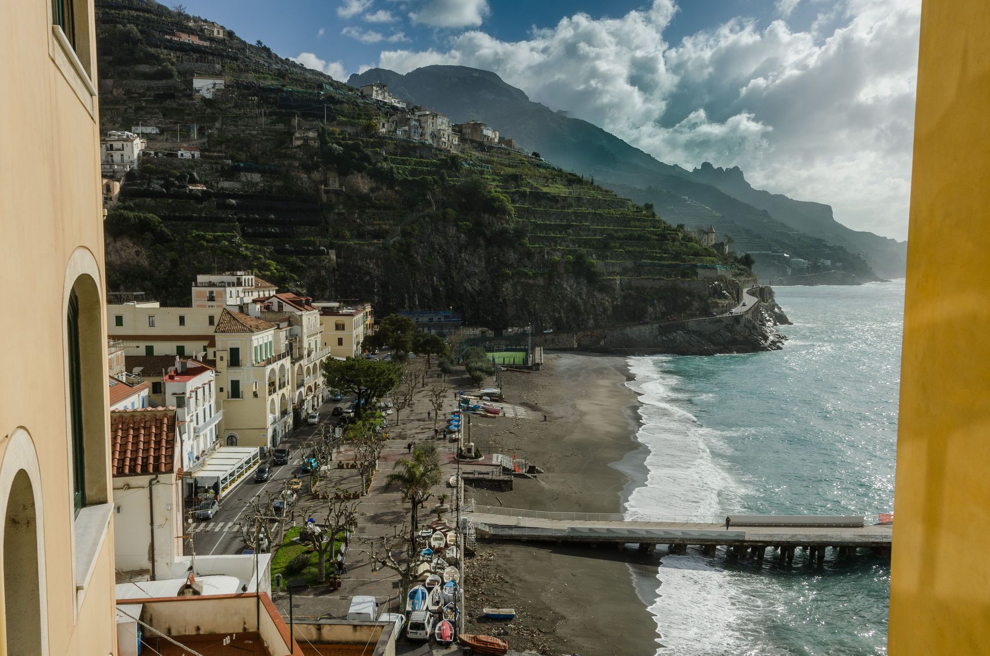 Our aforementioned rental had a big terrace. It can be seen to the far left in this shot, its black iron rail frame just visible in the distance, appearing as though jutting out from the top domed window. We were equidistant between Sal de Riso and his bro Alesandro's similar cafe, each about a 2 minute walk away.