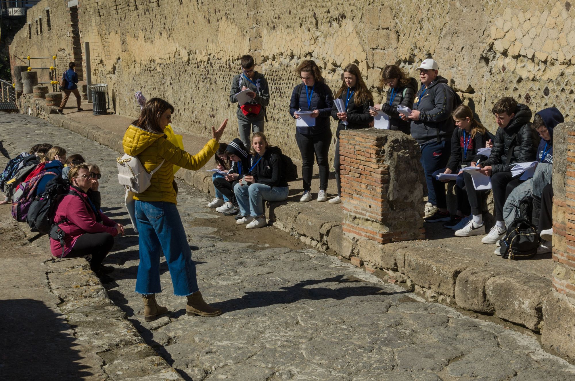 This Herculaneum tour guide explains about the ongoing excavations to a visiting high school group. She also explained how Herculaneum was a ritzy seaside resort destination--think Carmel. Archaeology buffs may also want to visit the Oplontis villa in nearby Torre Anunziata--the wall paintings there are fantastic.
