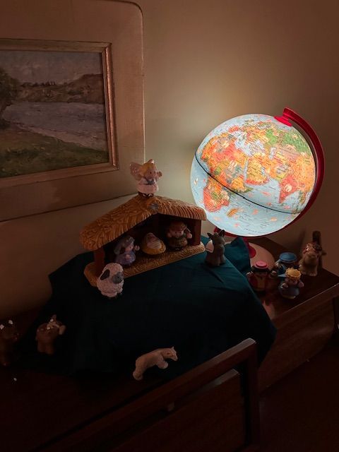 Kate’s Little People nativity. I set it up every year. She used to add dinosaurs and polar bears and giraffes.
