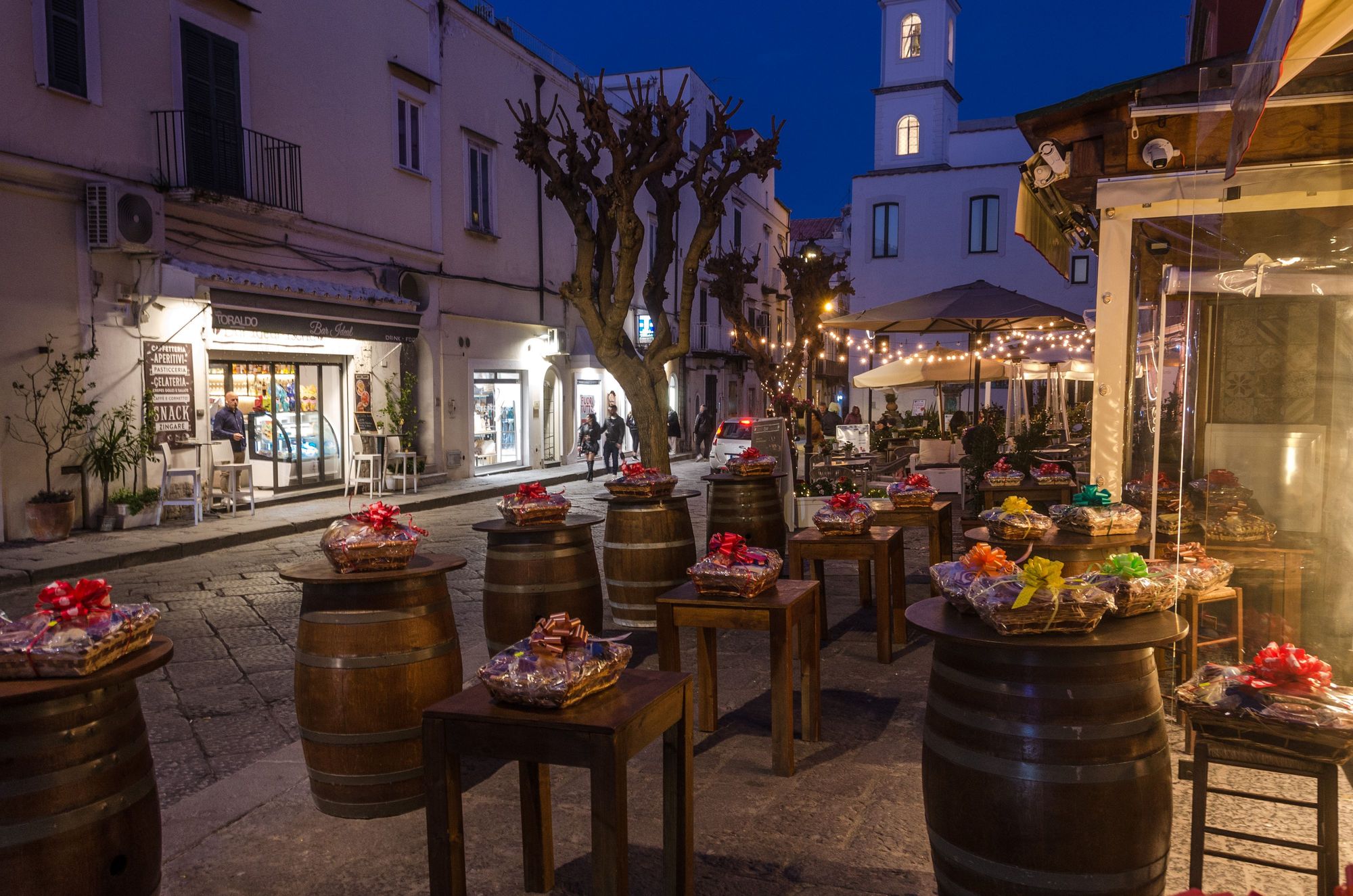 Just outside our rental: a shoulder season night scene along Ponte's main drag.