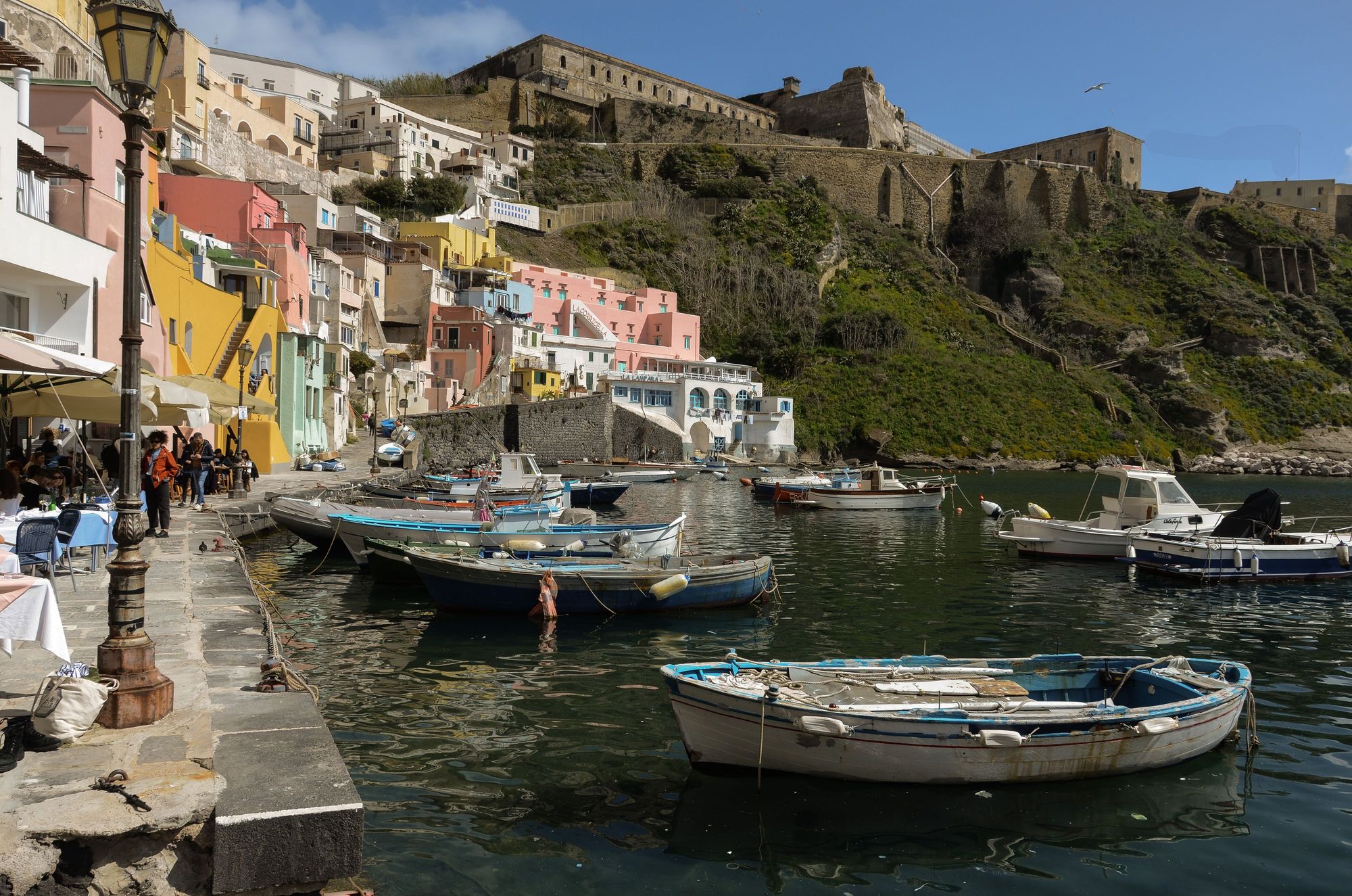 Prior to covid, we'd originally booked a week at the Corricella Hotel. It is that pink building dead center. Their Lampana restaurant also has an exceptional perspective. The contrasting dullness of the former prison Castell d'Avalos aka Palazzo Reale (closed 1988) looms overhead. mafia figures were once imprisoned there.