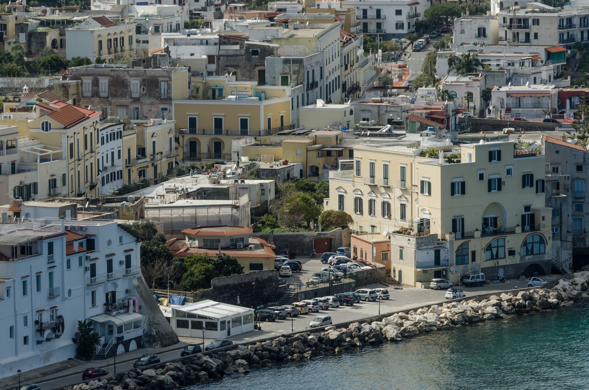 Our creamy-colored rental building to the right. We were on the top floor, near corner. The lower building directly below our patio was the INPS. I gathered that was some sort of combo government-run-job-agency-cum unemployment office? The island population is 64,000 but I've no idea what jobless numbers are nowadays. That INPS also doubled as a handy bus stop. Bus 7 goes from Porto down to Ponte, a distance that otherwise can be walked in about 45 minutes.