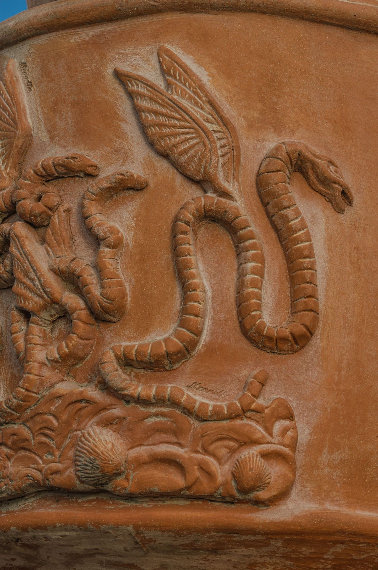 We concluded the tour in Cassa(micciola). It too had its own port. It also had the impossible-to-miss Menella bros clay art emporium, a large affair with a prominent outdoors display. Their products bold and demanded closer observation. Ancient Roman themes abounded, and so did mythology.