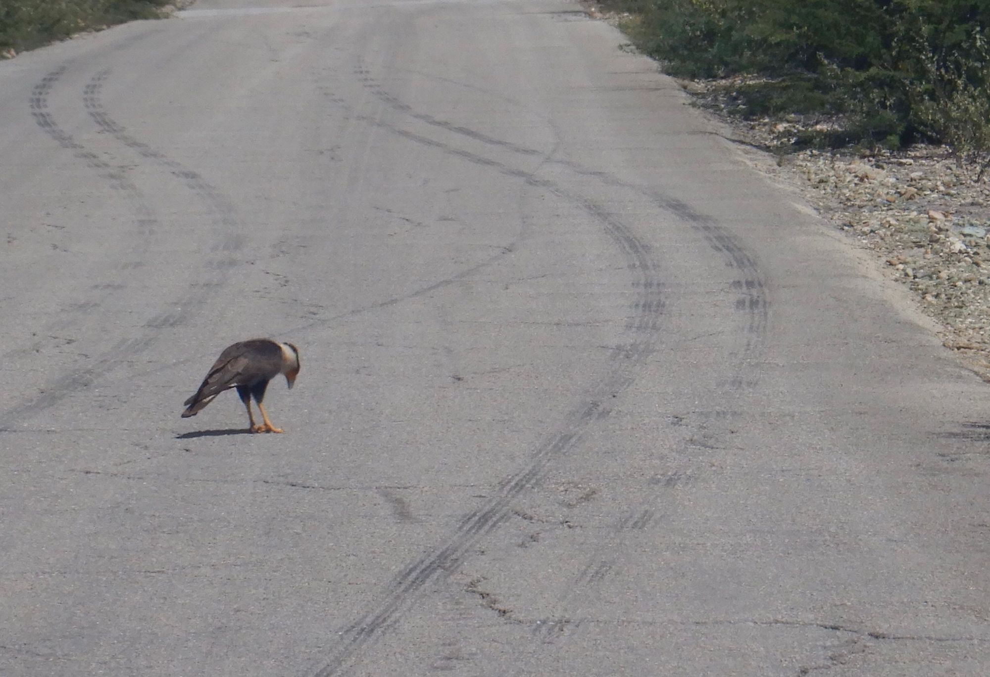 Crested caracara staring at his toes.