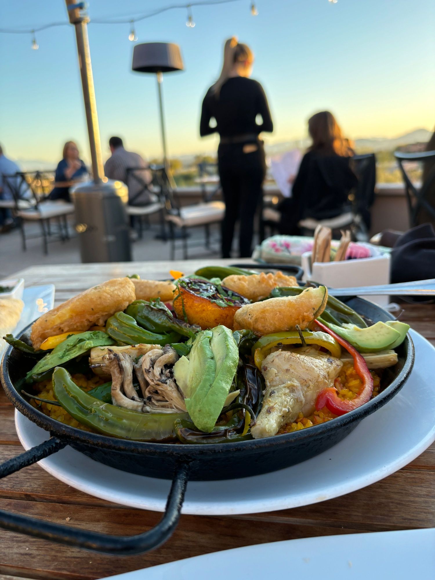 ( vegetable) paella and a fabulousd view which you can’t really see here . It had grilled artichokes, zucchini tempura, several kinds of wild mushrooms, avocado, a couple of kinds of mild peppers, garlic confit, and other things I can’t recTo start we had really good calamari. We were too full for dessert and took about half the paella home. Although the resort is snooty the restaurant is not. The patio is simply beautiful with a knockout view.
