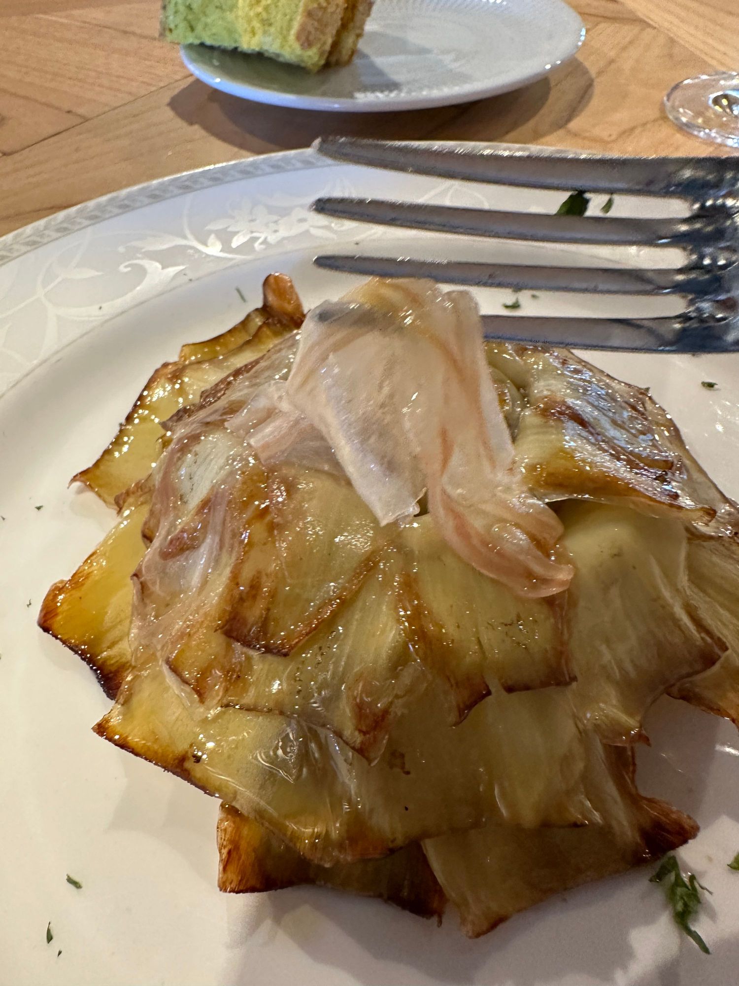 One single, perfect specimen: Artichoke heart opened like a flower, cooked and crisped on the edges, draped with Jamon Iberico whose gossamer sheets lavish fat and flavor on the artichoke below....an INCREDIBLE treat (5 euro)
