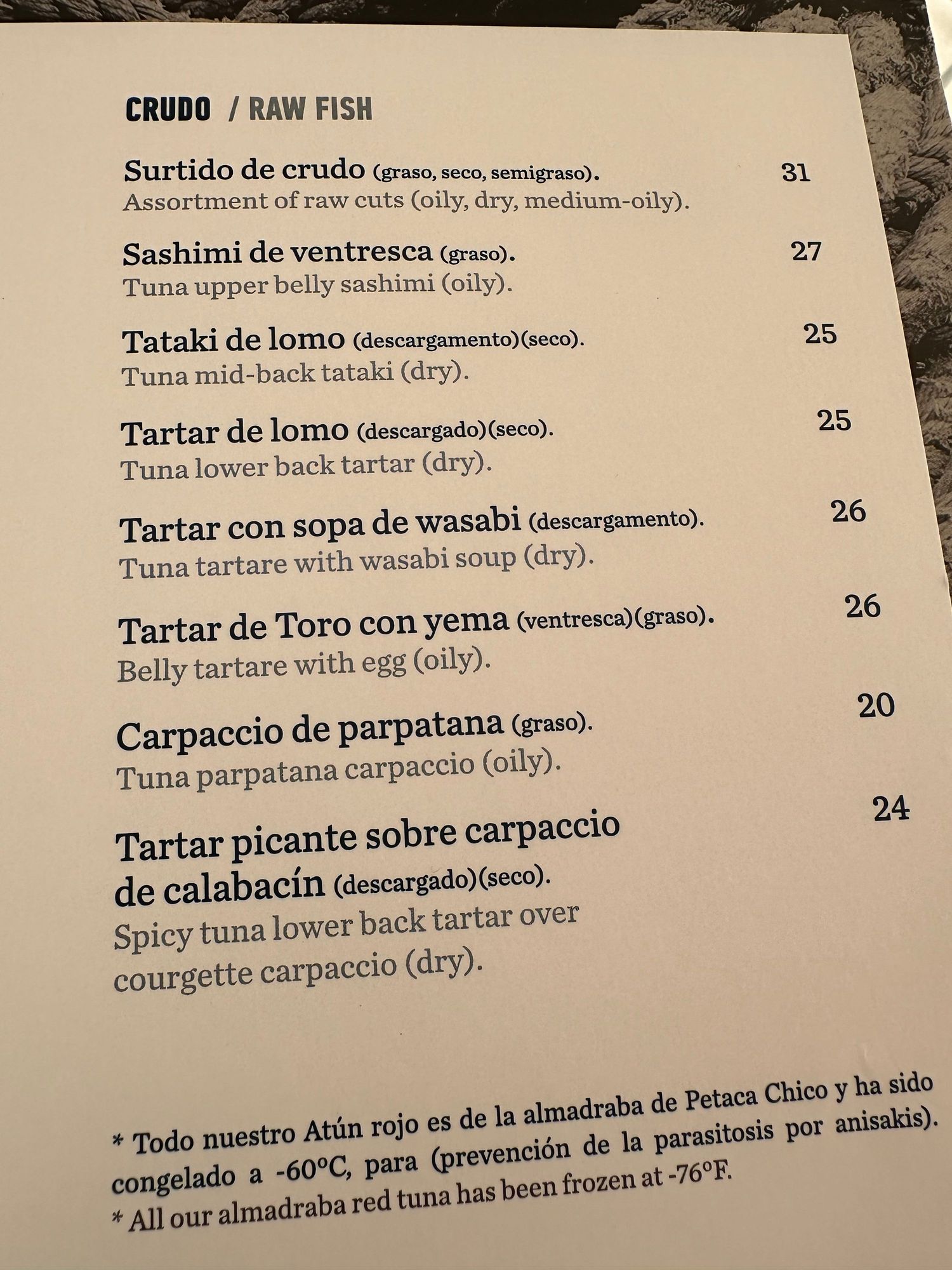 El Alferez carta (menu) of raw seafood dishes; this is just one section of the menu which also includes cooked seafood and fish.