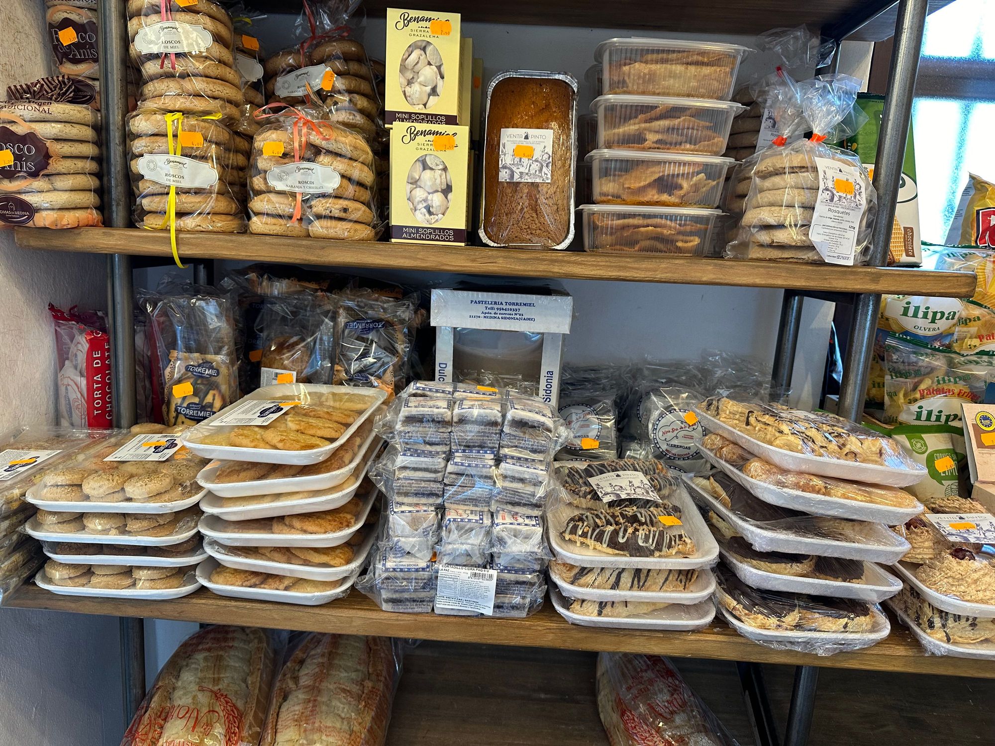 Patries at the colmado (shop) in Venta Pinto; my favorite,, the loaf of "bizcocho," sits in the center of the top shelf.