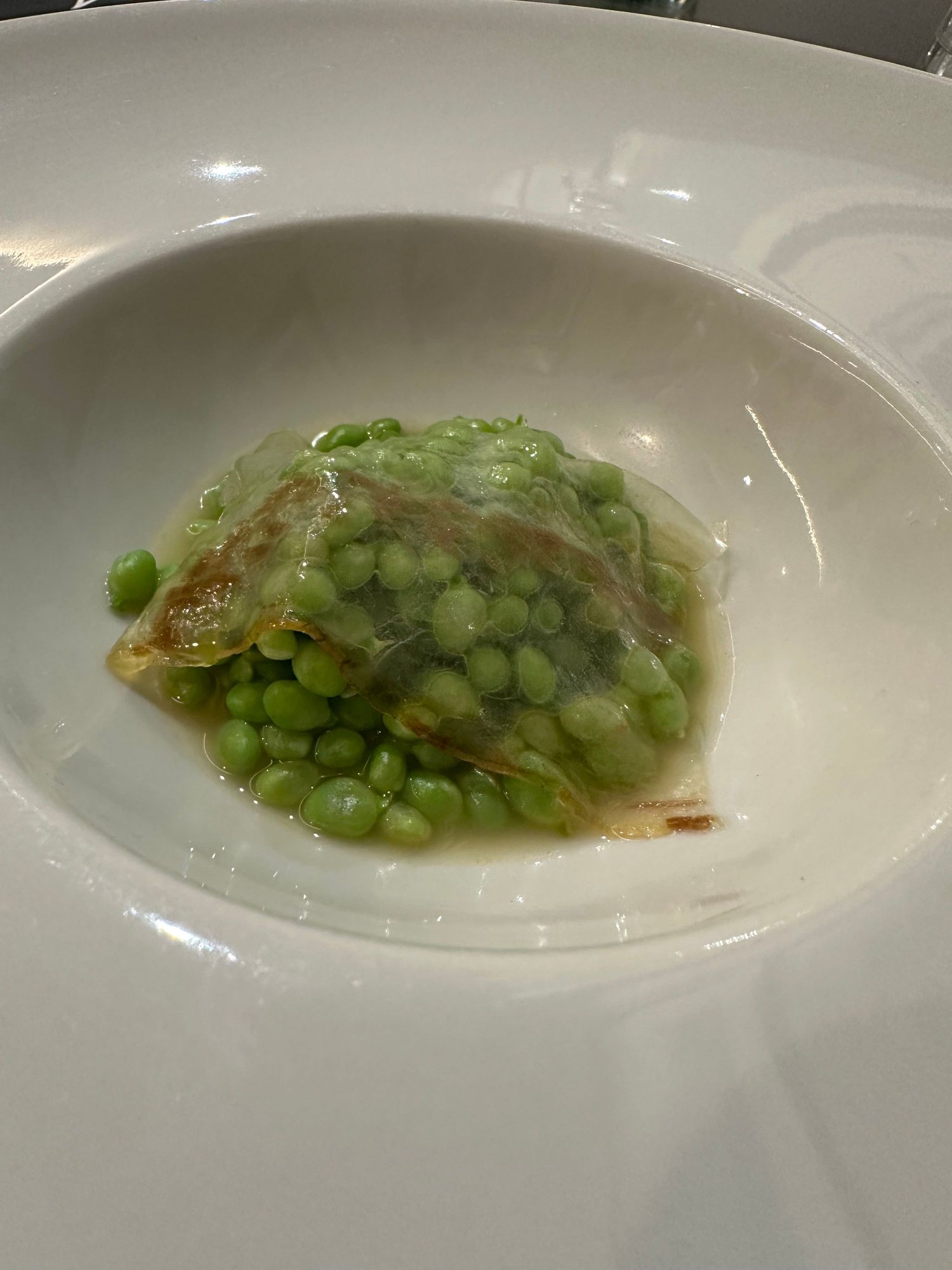 Guisantes del Maresme; you can just spy the thinnest sheet of jamon Iberico laid over the vegetable. You can now see why these are called "green pearls."
