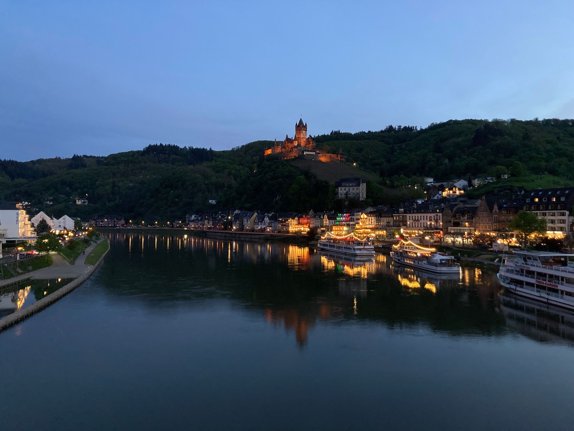 View of Cochem and its castle from the bridge at dusk