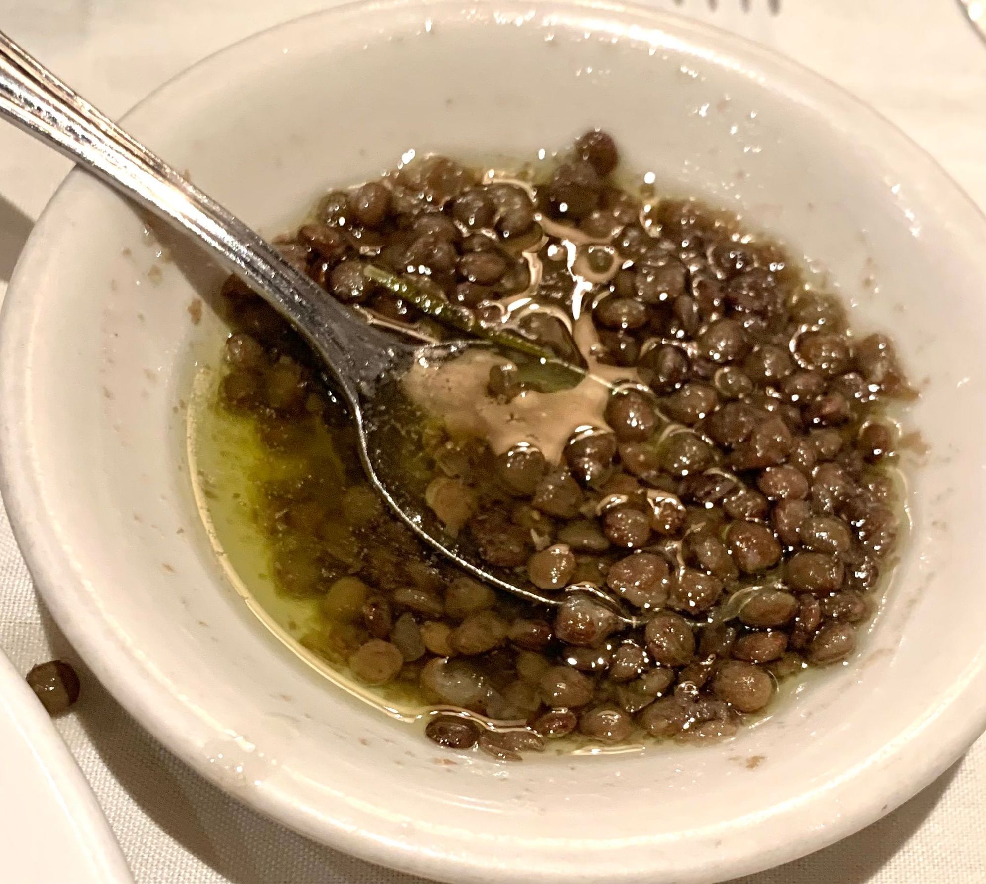 The oil served with the bread had lentils in it