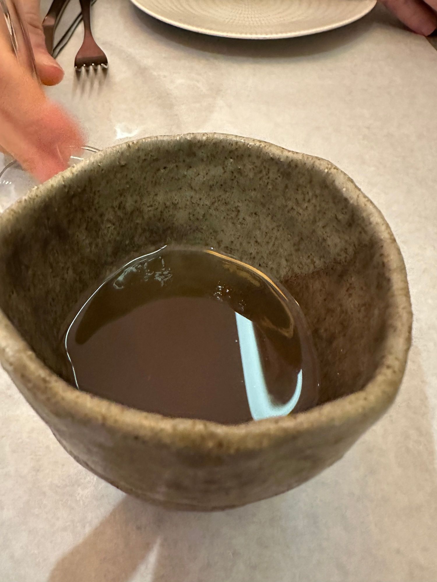 Incredibly delicious consommé presented in a handmade ceramic bowl as a complimentary first course. A harbinger of delicious things to come! I think the base was poultry.