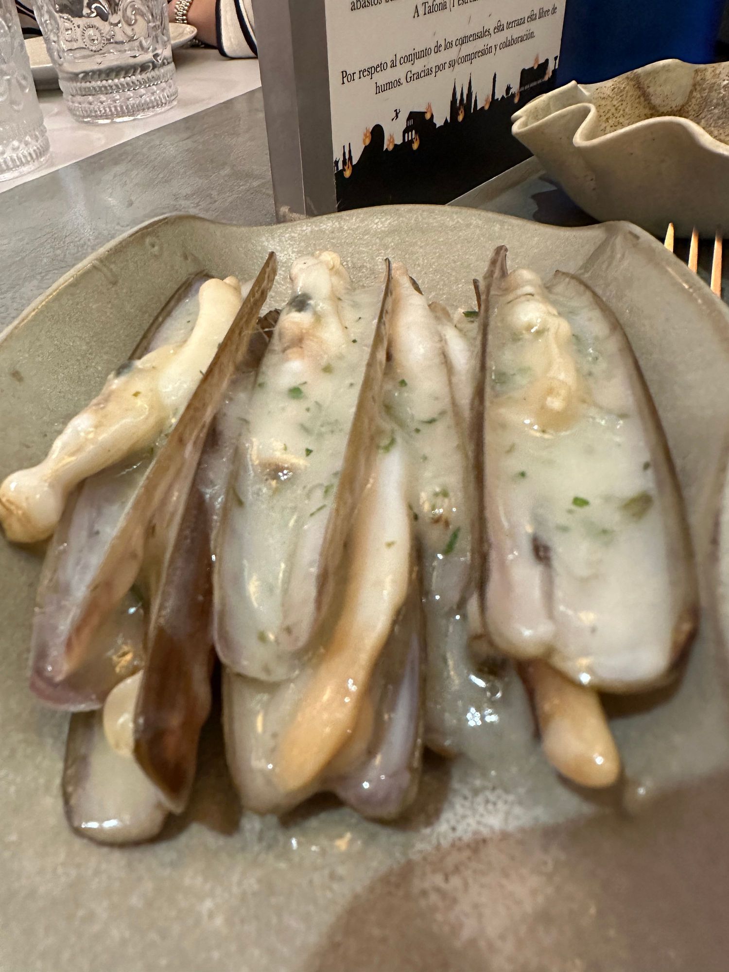 These navajas were sauced with pil pil, one of a choice of four sauces offered with the impeccble shellfish dishes. This is a half racion; to complement these, I had a half order of berberechos with a different, more spicy, sauce that was so great I lifted the cup with the remaining sauce to my lips and scoured the entire bowl without a thought of etiquette.