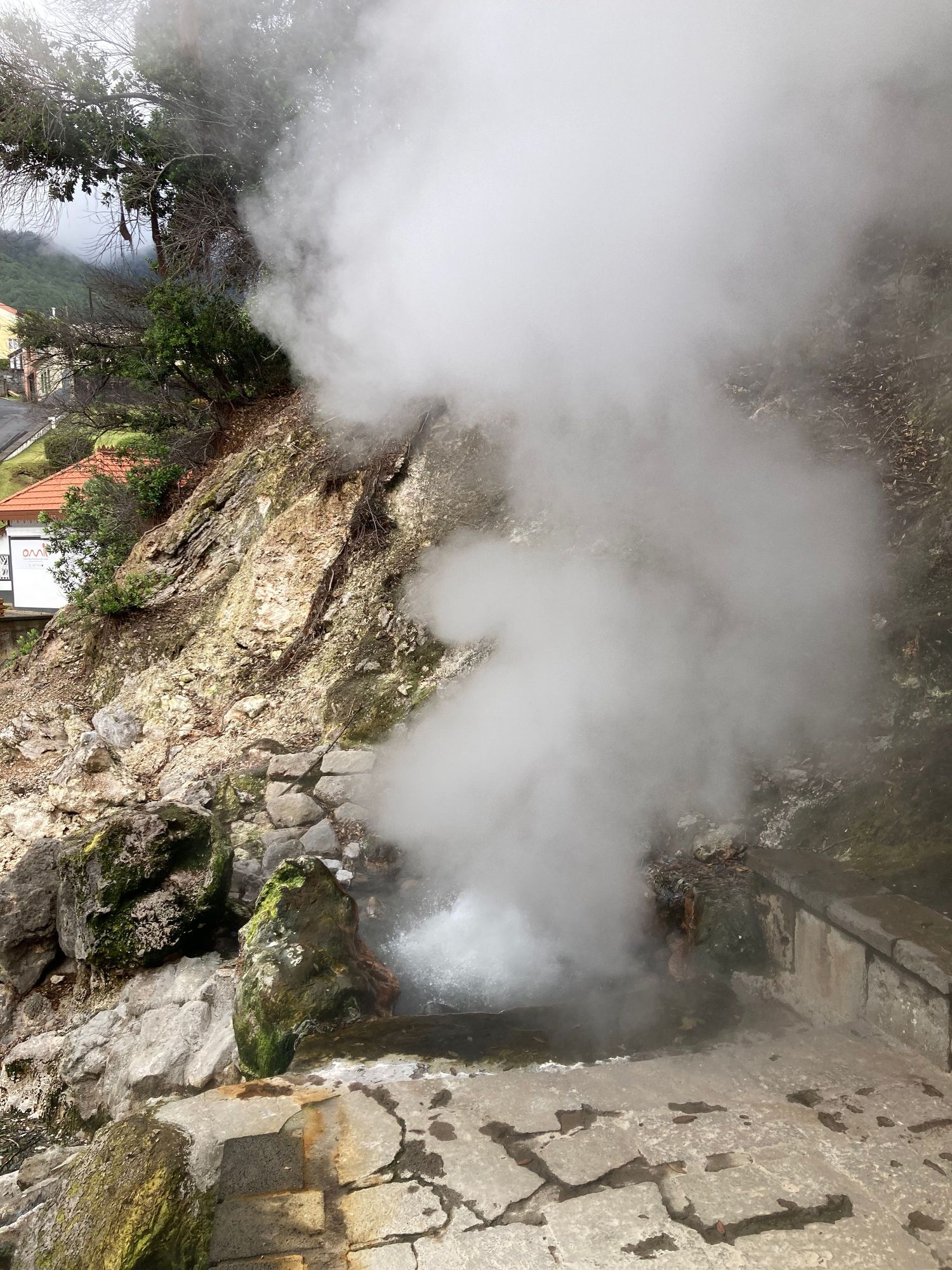 In Furnas: fumaroles are vents or openings at the surface that emit vapours from underground volcanic activity.