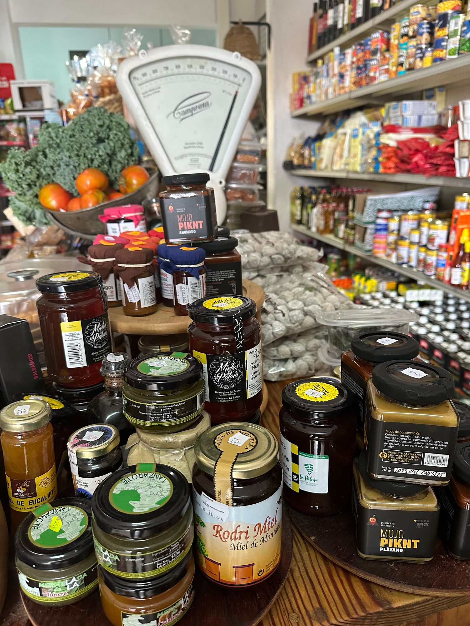Interior of LA TIENDA DE LOURDES, where I received an education in foods of Lanzarote including cheeses and spirits, including the ubiquitous island tipple, Ron Miel (!!!). Wonderful shop....so many workers and patrons trying to help me learn more about local foods! In the town of SOO, near Famara.