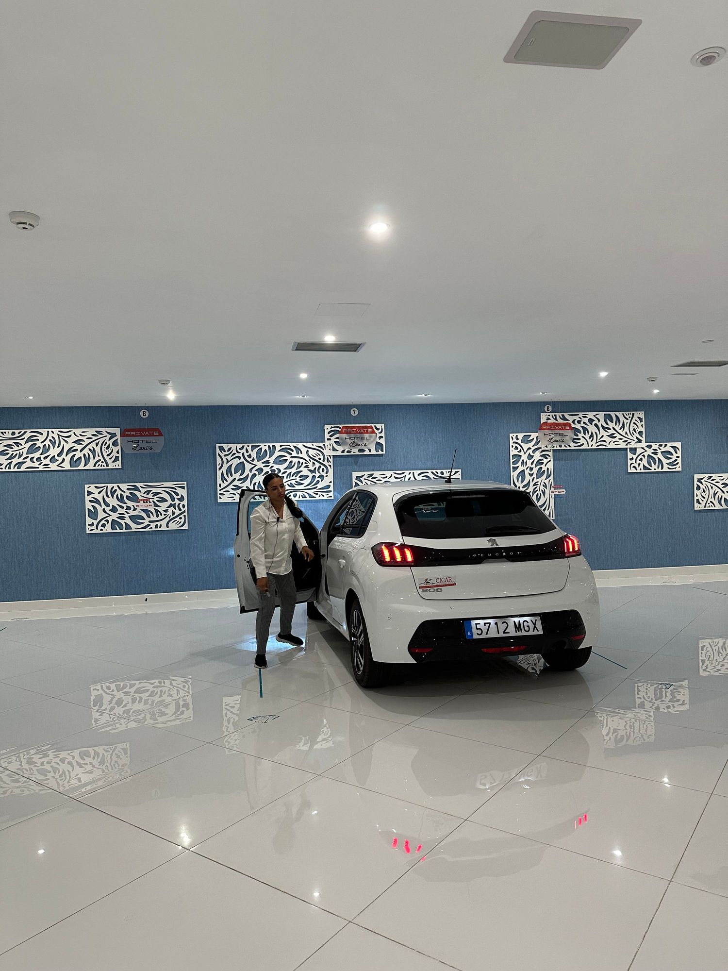Our rental car in the sparkling clean garage at Lani's Suites..have you ever seen wallpaper in a parking garage before?
