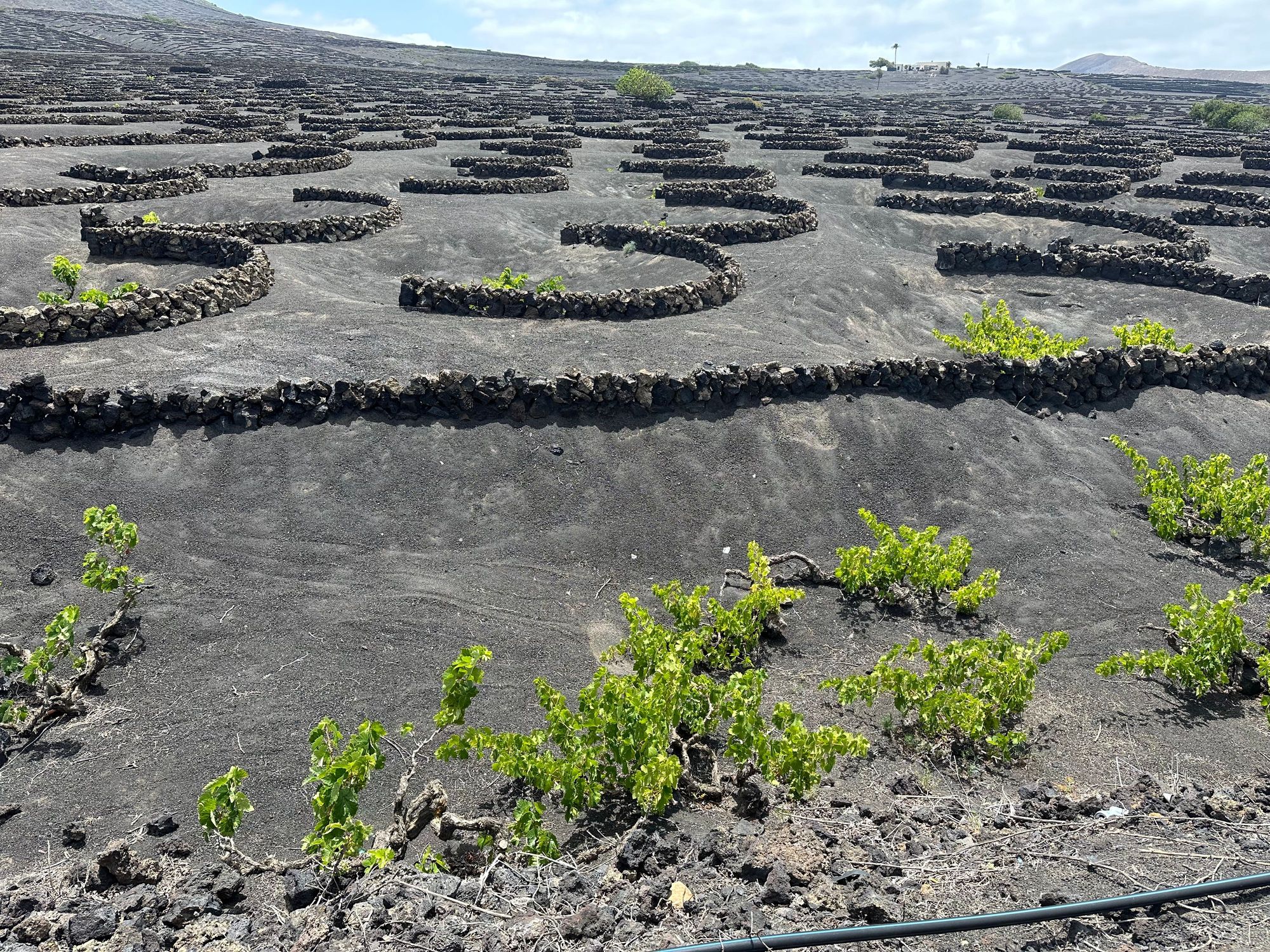 Lava stone windbreaks protect deeply embedded grape vines