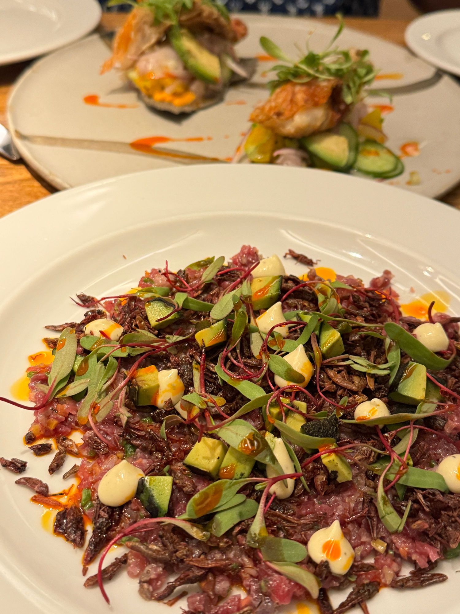 Beef carpaccio with grasshoppers, and a almost-finished fish tostada.