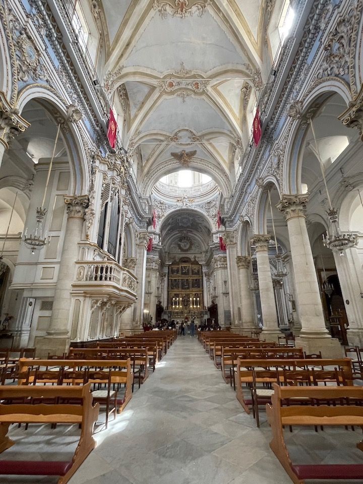 The Duomo di San Giorgio is the main church of Modica. It stands at the top of a 250-step staircase (see previous photo where I noted the bougainvillea). This is the Baroque interior.