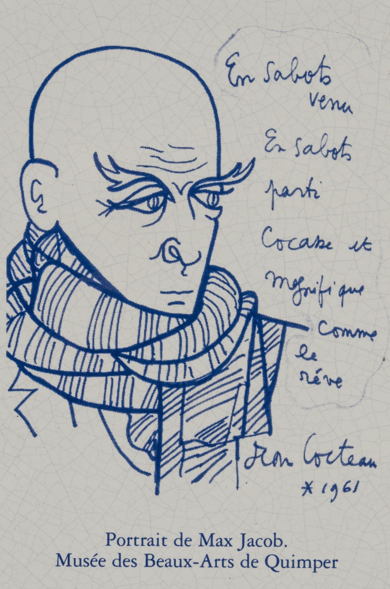 For a century, that brasserie-by-the-prefecture had been the hang-out for local intelligentsia. One was the beloved local Max Jacob, taken to his death by the Nazis. Cocteau later created this iconic sketch and it appeared inside one of the 8 glass showcases which comprised the above-mentioned historic display. Copies of the image appeared here and there across the town.
