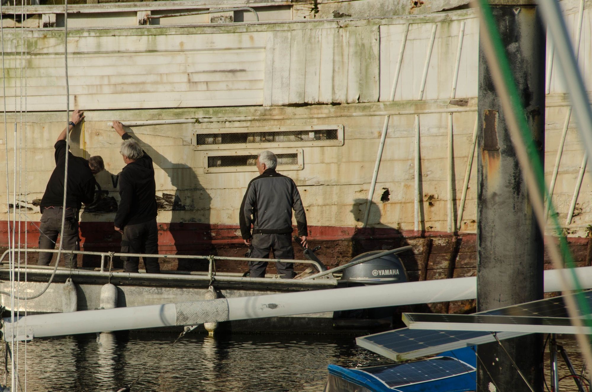 Crew were at work throughout this museum. Here, three men examine the hull of the rusting old 'Scarweather' meteo-boat. It had a unique feature in the form of mounted lighthouse in its middle.