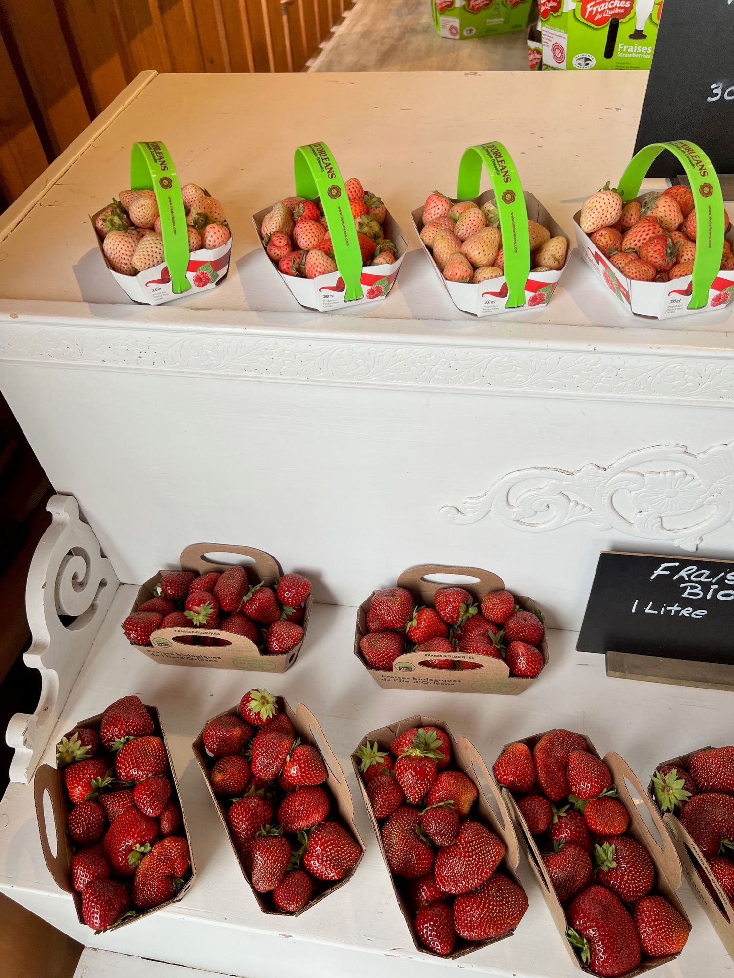 Though they look like unripe strawberries, the "white" strawberries on the upper shelf were actually sweet and delicious.